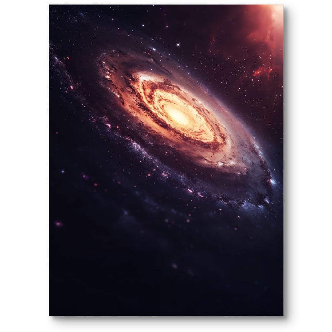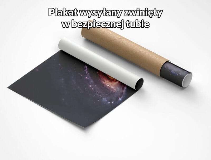 Kompozycję plakatu cechuje dynamiczna harmonia – błyszczący, jasny rdzeń galaktyki przyciąga spojrzenie, a spiralne ramiona stopniowo prowadzą wzrok w głąb przestrzeni. Żarzące się odcienie pomarańczowego i bieli kontrastują z głębią aksamitnego kosmosu, potęgując wrażenie energii i wielowymiarowej głębi.