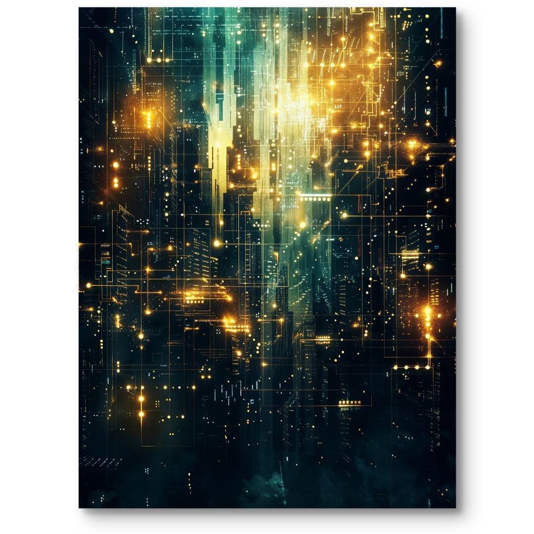 Plakat przedstawia intrygującą wizję futurystycznego miasta, zdominowanego przez jasno świecące, żółte neony oraz kontrastujące ciemnozielone i czarne detale architektury. To artystyczna interpretacja świata przyszłości, gdzie dominują tempo rozwoju technologicznego i cyfrowa dynamika.