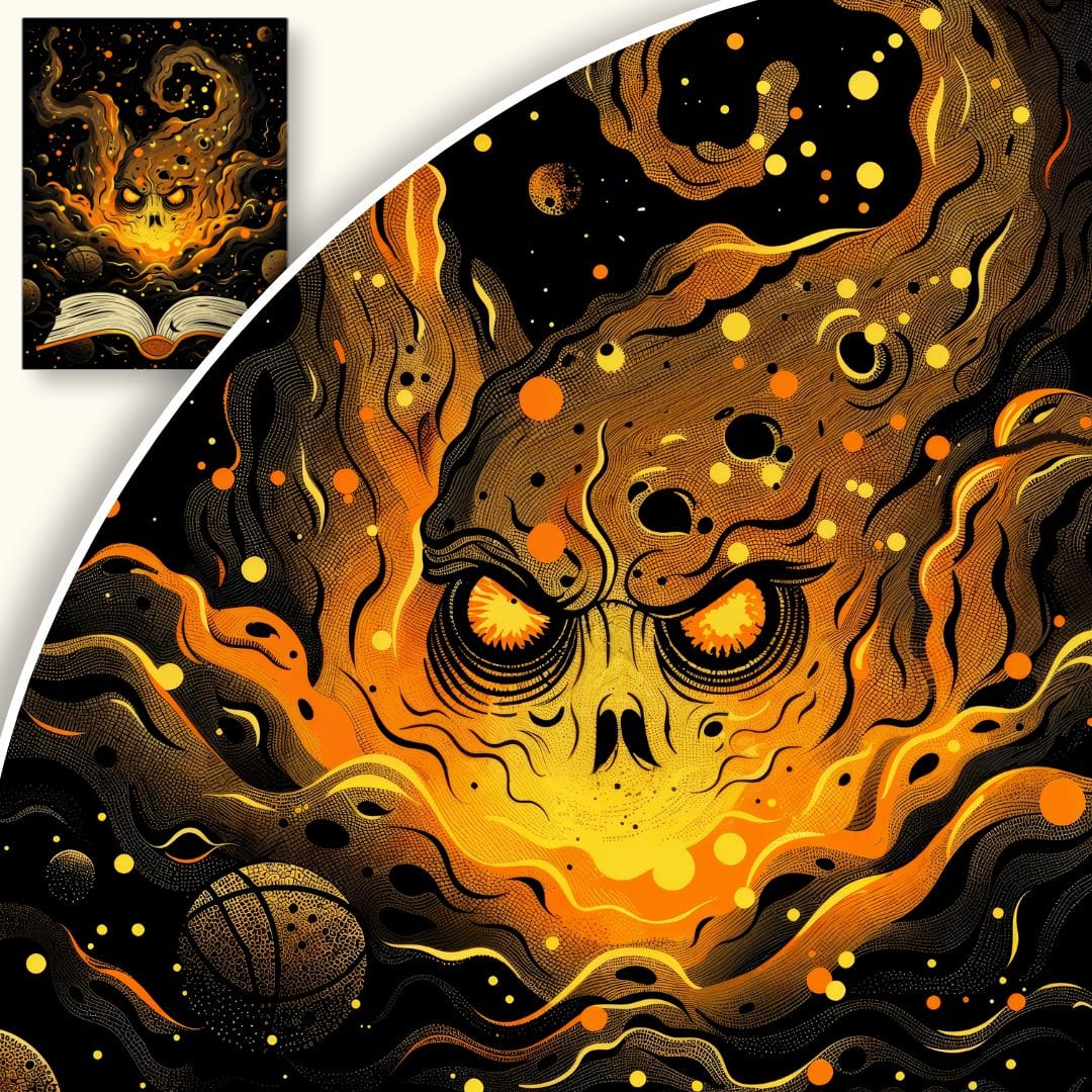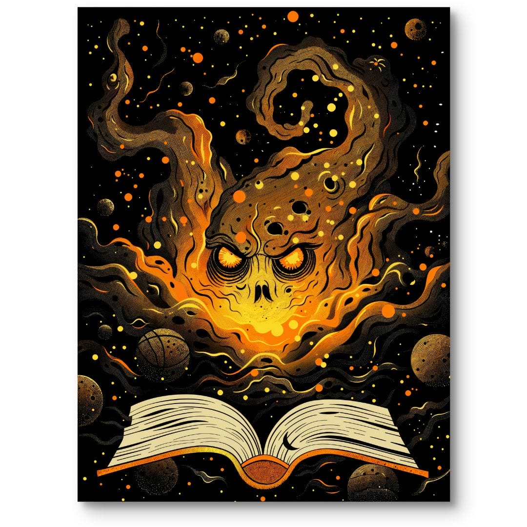 Ten wyjątkowy plakat ukazuje scenę przenikającą granice filozoficznej refleksji i literackiej fantastyki. Na pierwszym planie widoczna jest otwarta księga, z której wyłania się intrygująca, płomienna czaszka otoczona przez wirujące kosmiczne pyły i planety. Połączenie motywów czaszki, ognia oraz nieskończonego kosmosu kreuje atmosferę magii i sekretów, charakterystycznych dla gatunku fantasy.