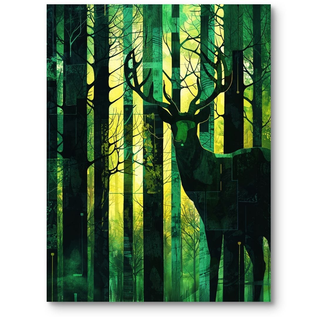 Plakat na ścianę ukazuje dostojnego jelenia w leśnej scenerii, zdominowanej przez głębokie odcienie zieleni i żółci. Centralnie ustawiona sylwetka zwierzęcia przyciąga spojrzenia, a abstrakcyjne, dynamiczne tło lasu nadaje plakatowi aurę tajemnicy i magii.
