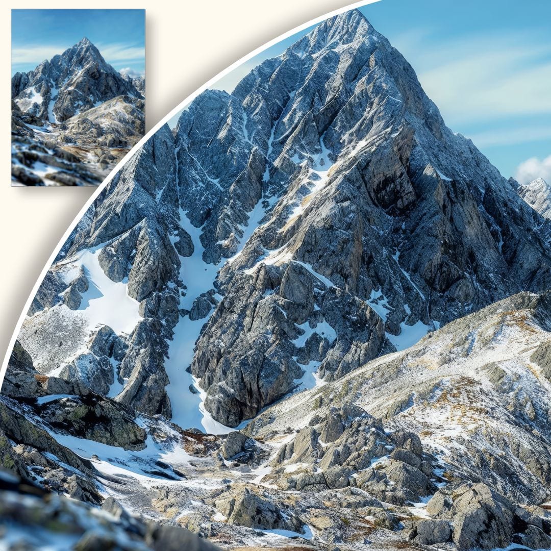 Kompozycja zachwyca lekką symetrią – centralnie umieszczony masyw górski współgra z delikatniejszymi śnieżnymi zboczami, wprowadzając harmonię. Chłodne odcienie niebieskości, szarości i bieli podkreślają zimową atmosferę, a wyraźne światłocienie uwydatniają ostrość konturów i głębię pejzażu. Całość emanuje świeżością oraz spokojem charakterystycznym dla zimowego górskiego krajobrazu.