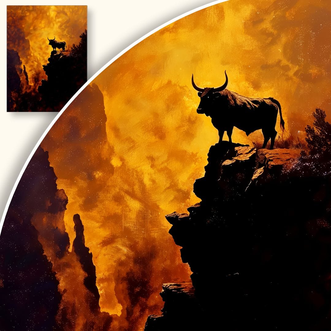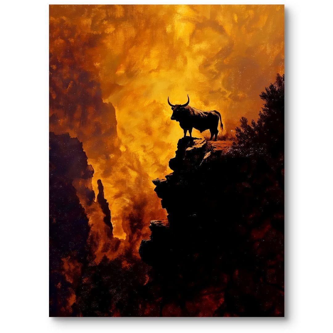 Plakat ukazuje imponującego byka, dumnie stojącego na krawędzi urwiska, z ogniście rozświetlonym niebem i surowymi skałami w tle. Ta dynamiczna scena jest potężnym symbolem siły, odwagi oraz niezależności, doskonale łącząc majestatyczną sylwetkę zwierzęcia z nieposkromionym żywiołem górskiego krajobrazu.