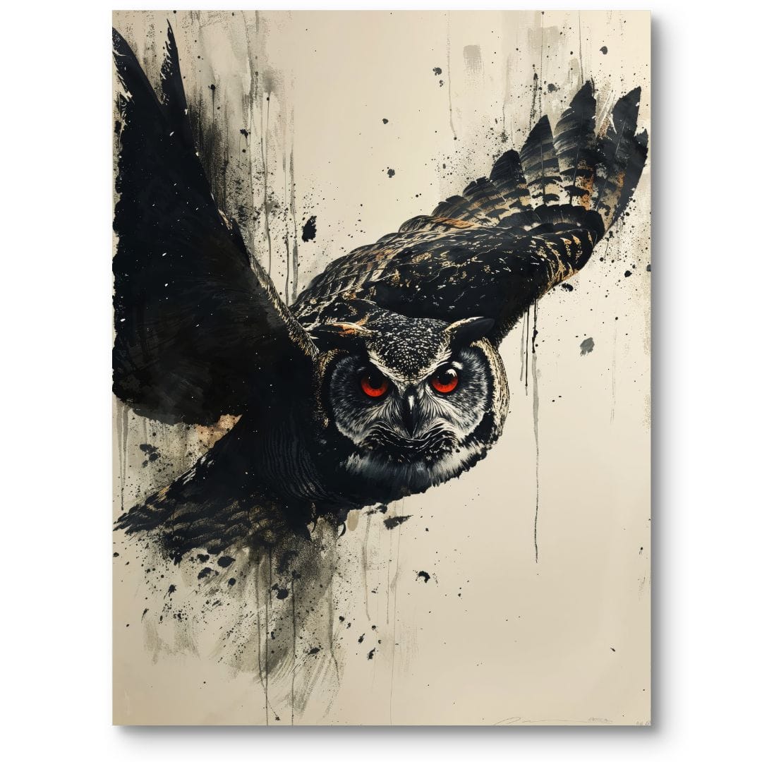 Ten plakat prezentuje niezwykle realistyczny portret sowy w locie, której czerwone, hipnotyzujące oczy przyciągają wzrok i budują aurę tajemniczości. Sowa, od wieków symbolizująca mądrość i enigmatyczność, została ukazana w nocnej scenerii, w której dominują głębokie, ciemne barwy. Starannie oddane detale piór i ostre kontury ożywiają obraz, nadając mu wyjątkową dynamikę i ekspresję.