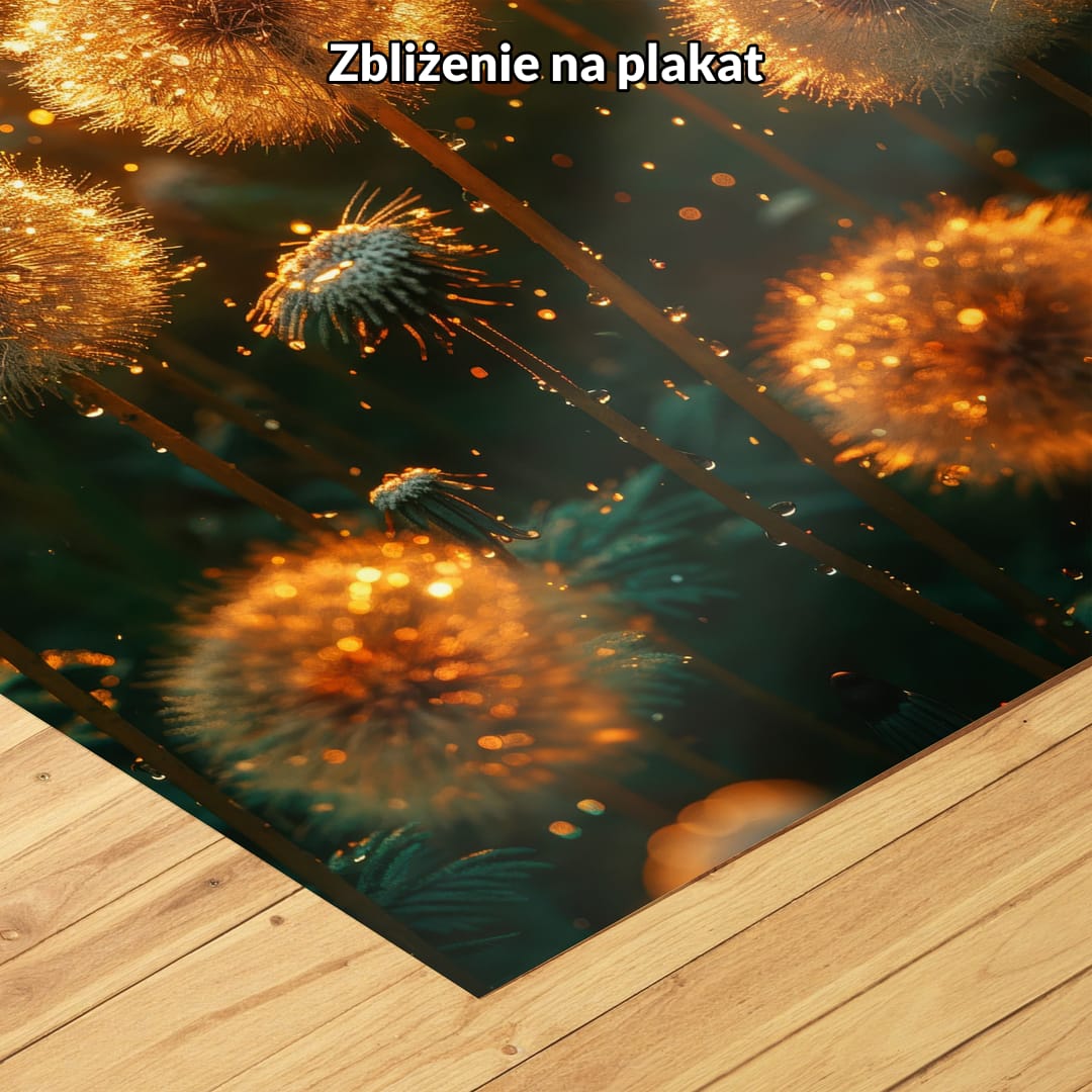Plakat ukazuje zachwycającą scenę natury – dmuchawce unoszące się lekko w powietrzu, otulone złotymi, migotliwymi iskierkami. Promienie słońca subtelnie rozświetlają całość, nadając kompozycji wyjątkowy, harmonijny klimat oraz aurę spokoju i elegancji.