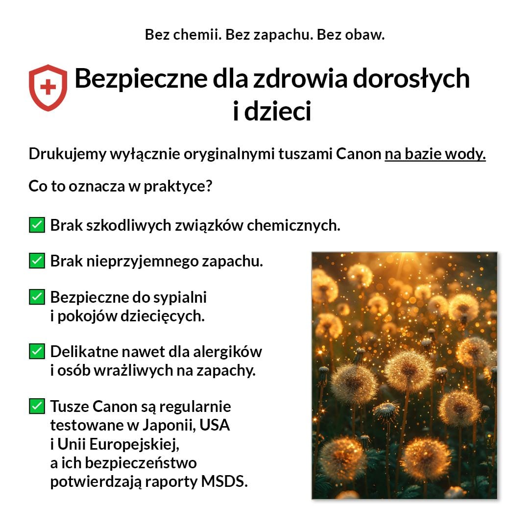 My drukujemy wyłącznie na pigmentowych tuszach Canon LUCIA PRO, bezpiecznych, bezzapachowych i certyfikowanych.