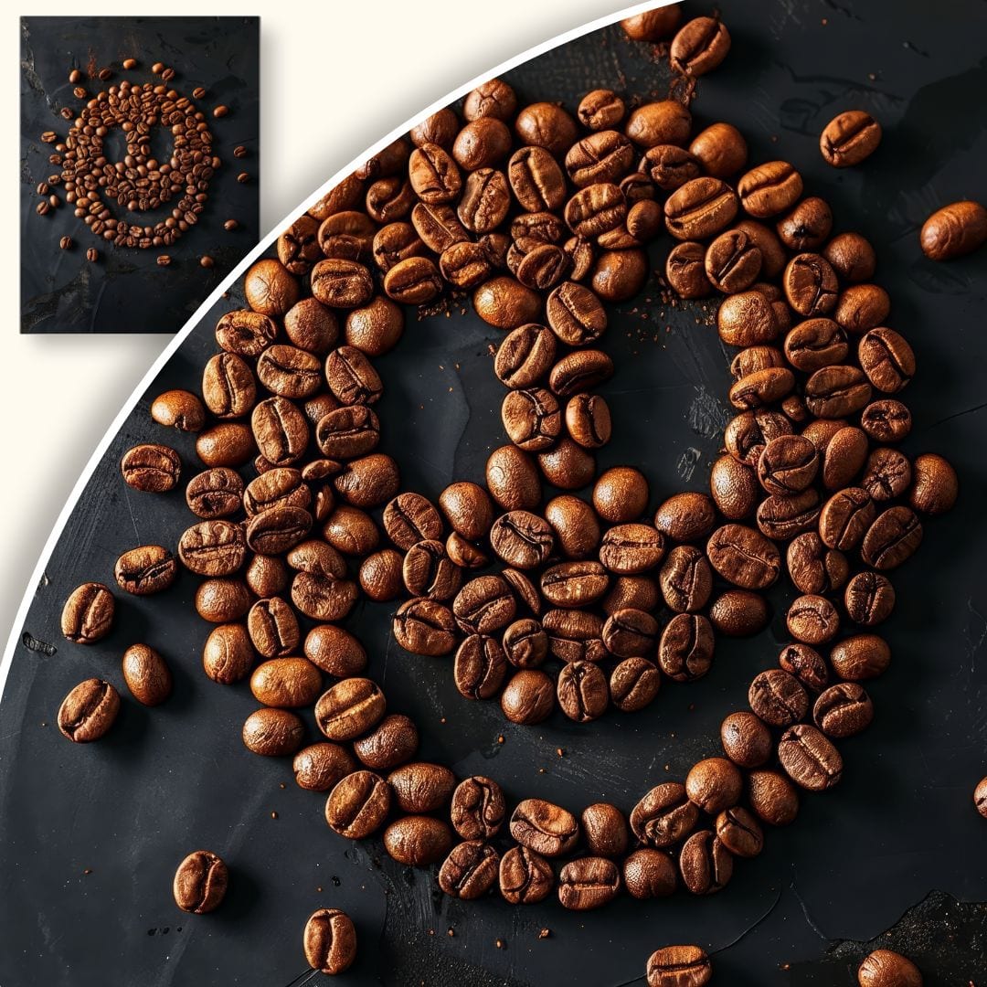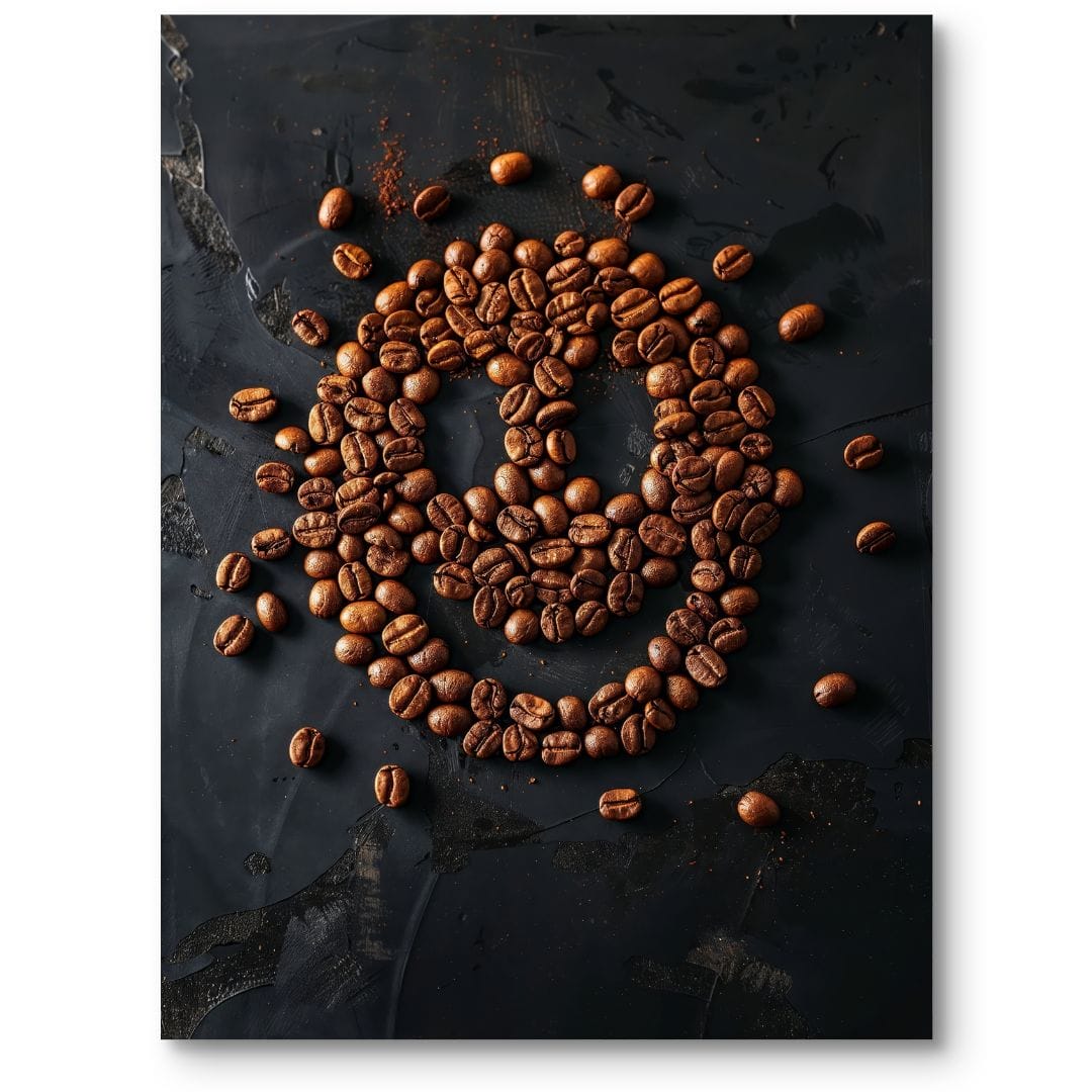 Plakat przedstawia ziarna kawy starannie ułożone w kształt uśmiechu na głębokim, teksturowanym tle. Główny motyw – aromatyczne ziarna kawy – nadaje całości minimalistycznego, ale niezwykle sugestywnego wyrazu, zachwycając zwłaszcza miłośników kawy i prostoty w sztuce. Kontrast między ciemnym tłem a ciepłymi odcieniami ziaren przyciąga spojrzenie, tworząc kompozycję, która wyróżnia się w każdej przestrzeni.