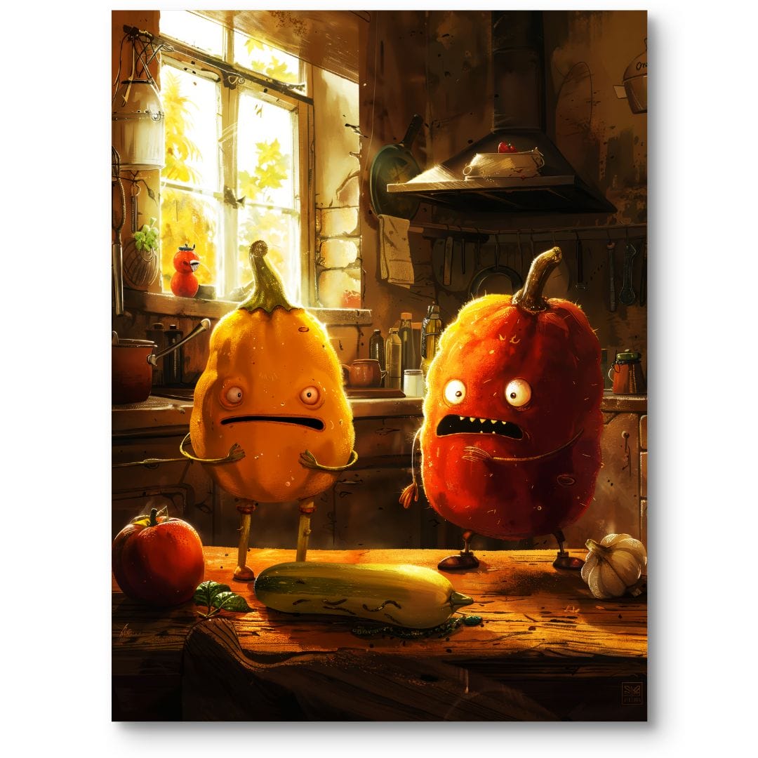 Ten niepowtarzalny plakat przedstawia rozbawioną, surrealistyczną scenę rozgrywającą się w sercu domowej kuchni. Bohaterowie – barwne, antropomorficzne warzywa, jak dynie i pomidory – z humorem oddają się codziennym czynnościom, zarażając optymizmem i energią. Ich zabawne miny ożywiają kompozycję, sprawiając, że trudno oderwać od niej wzrok.
