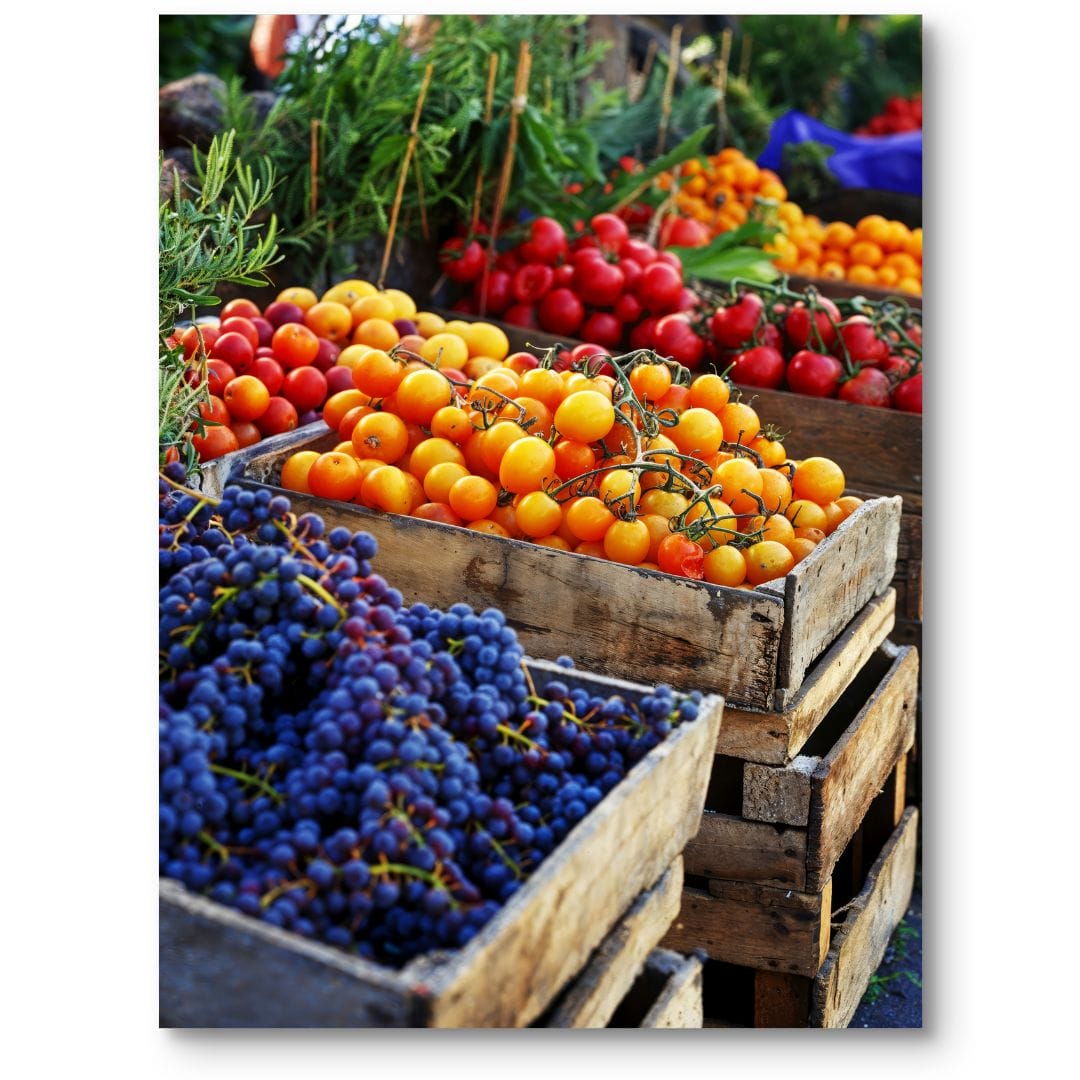 Prezentowany plakat ukazuje barwny, tętniący życiem rynek owocowo-warzywny, na którym soczyste pomidory oraz fioletowe winogrona zachęcają świeżością i naturalnością. Całość fotografii uzupełnia soczysta zieleń roślin, tworząc obraz pełen harmonii i autentycznego uroku.