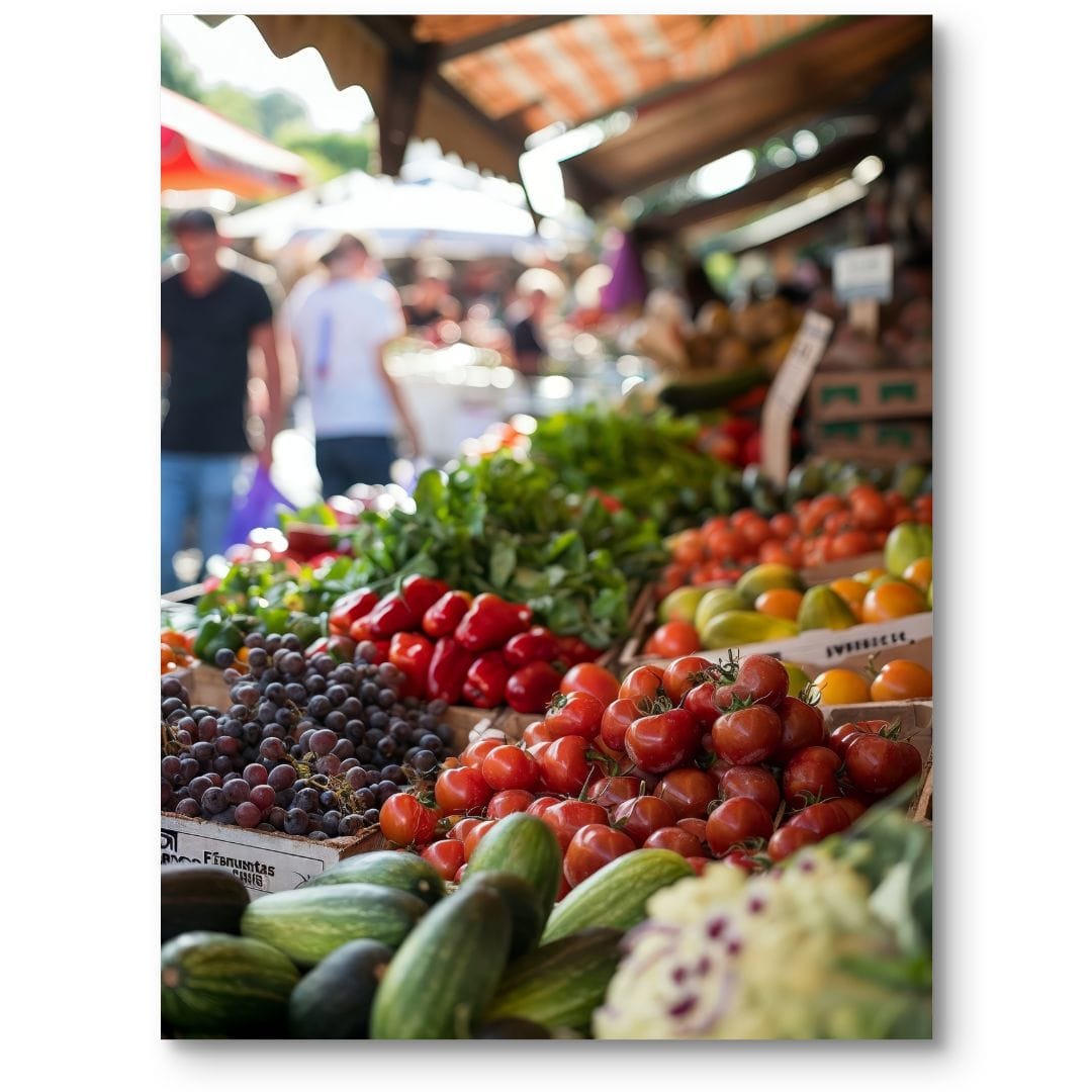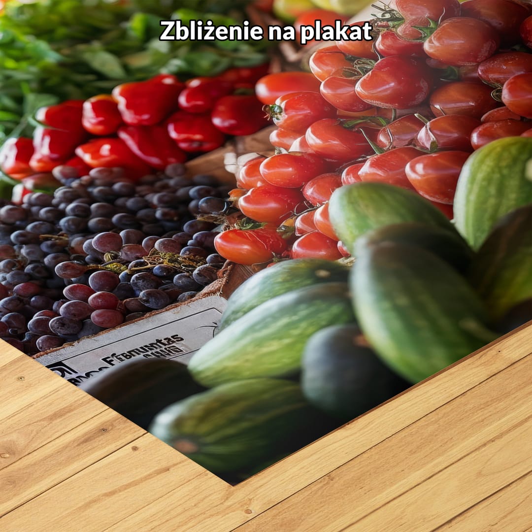 Ten wyjątkowy plakat oddaje atmosferę barwnego, pełnego życia targowiska, na którym królują soczyste warzywa i owoce: od pomidorów, przez papryki i winogrona, aż po ogórki. Każdy detal kompozycji zachwyca bogactwem kolorów i kształtów, wprowadzając do wnętrza autentyczny klimat lokalnego bazaru. Plakat został wykonany z wyjątkową dbałością o szczegóły, a realistyczna fotografia sprawia, że niemal czuć zapach świeżych produktów.