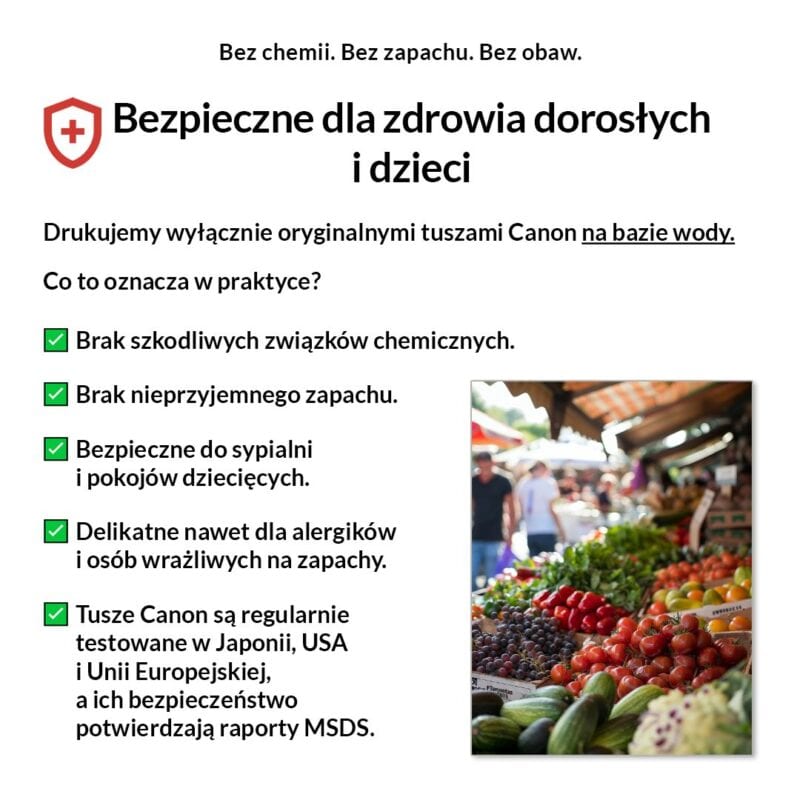 Tak, absolutnie! Drukujemy wyłącznie certyfikowanymi, bezwonnymi tuszami pigmentowymi Canon Lucia Pro na bazie wody. Są one w pełni bezpieczne dla zdrowia, nie zawierają rozpuszczalników i mogą być bez obaw stosowane w sypialniach i pokojach dziecięcych.