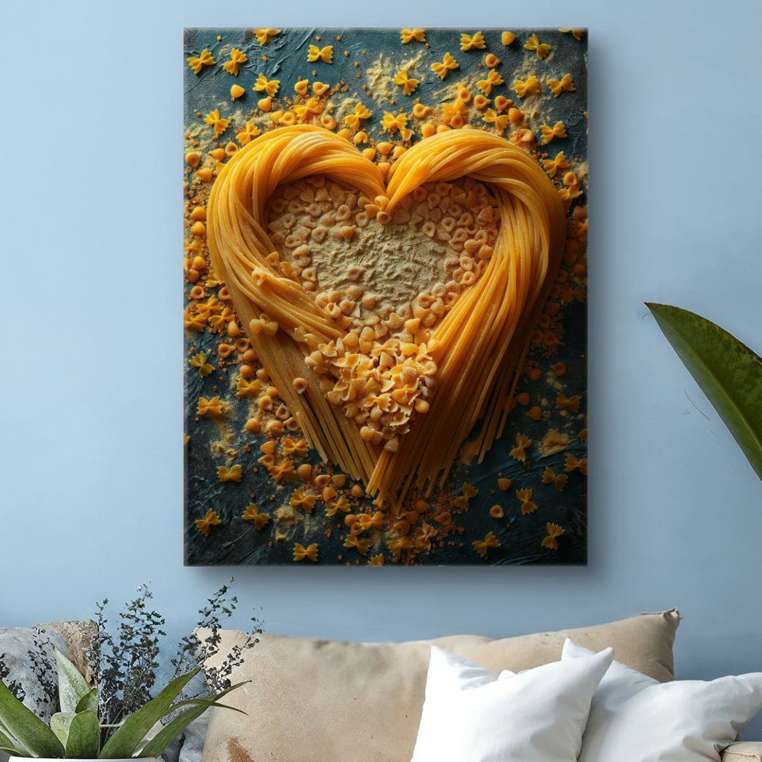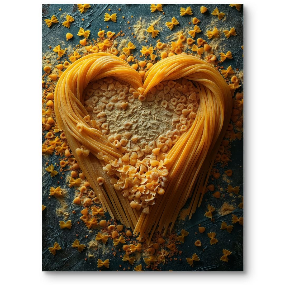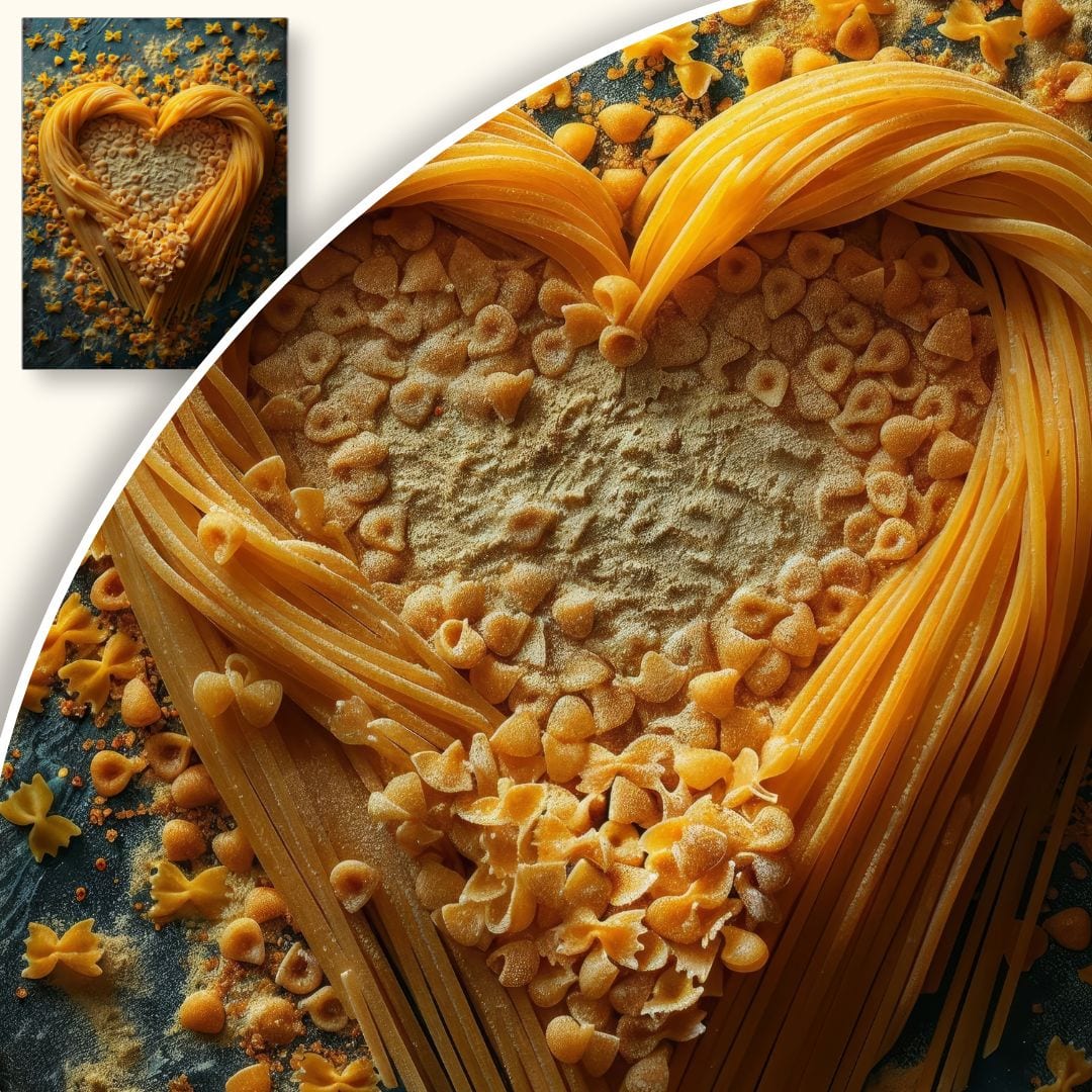 Starannie skomponowany kadr przyciąga wzrok do serca z makaronu w centrum. Ciepłe odcienie żółci i pomarańczu nadają całości przytulności, a kontrastujące, głębokie szarości tła podkreślają strukturę oraz tworzą poczucie elegancji i głębi.