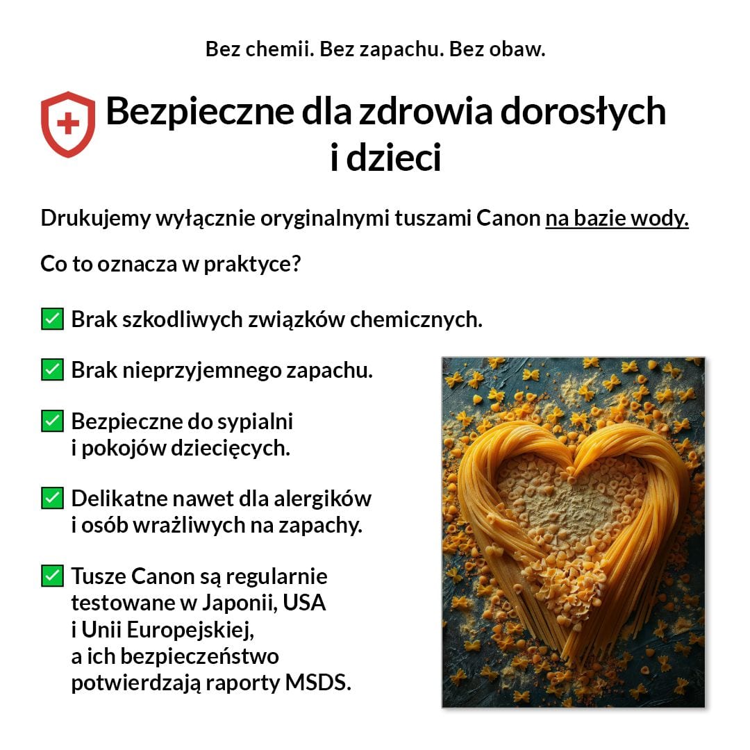 Tak, absolutnie! Drukujemy wyłącznie certyfikowanymi, bezwonnymi tuszami pigmentowymi Canon Lucia Pro na bazie wody. Są one w pełni bezpieczne dla zdrowia, nie zawierają rozpuszczalników i mogą być bez obaw stosowane w sypialniach i pokojach dziecięcych.