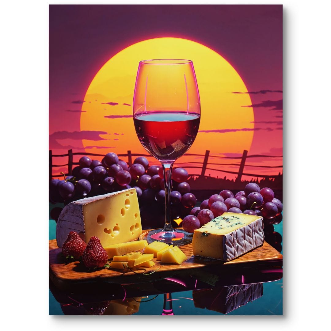 Prezentowany plakat zachwyca starannie wykreowaną sceną martwej natury: kieliszek czerwonego wina, otoczony bogactwem serów, soczystych winogron oraz świeżych poziomek, umieszczony na tle spektakularnego zachodu słońca. Artysta uchwycił ten moment tak, by oddać niepowtarzalną atmosferę kulinarnej uczty połączonej z magią wieczornego światła.