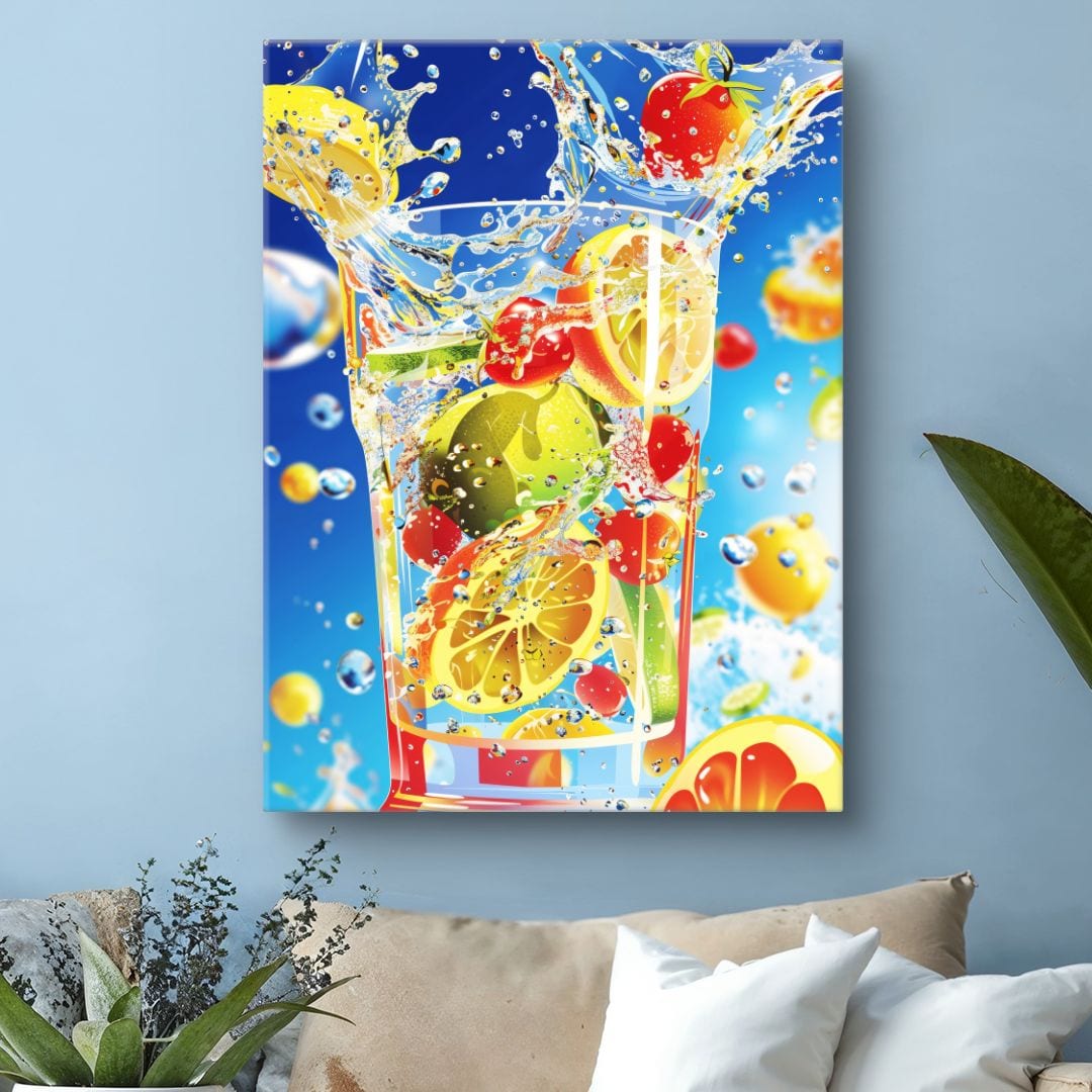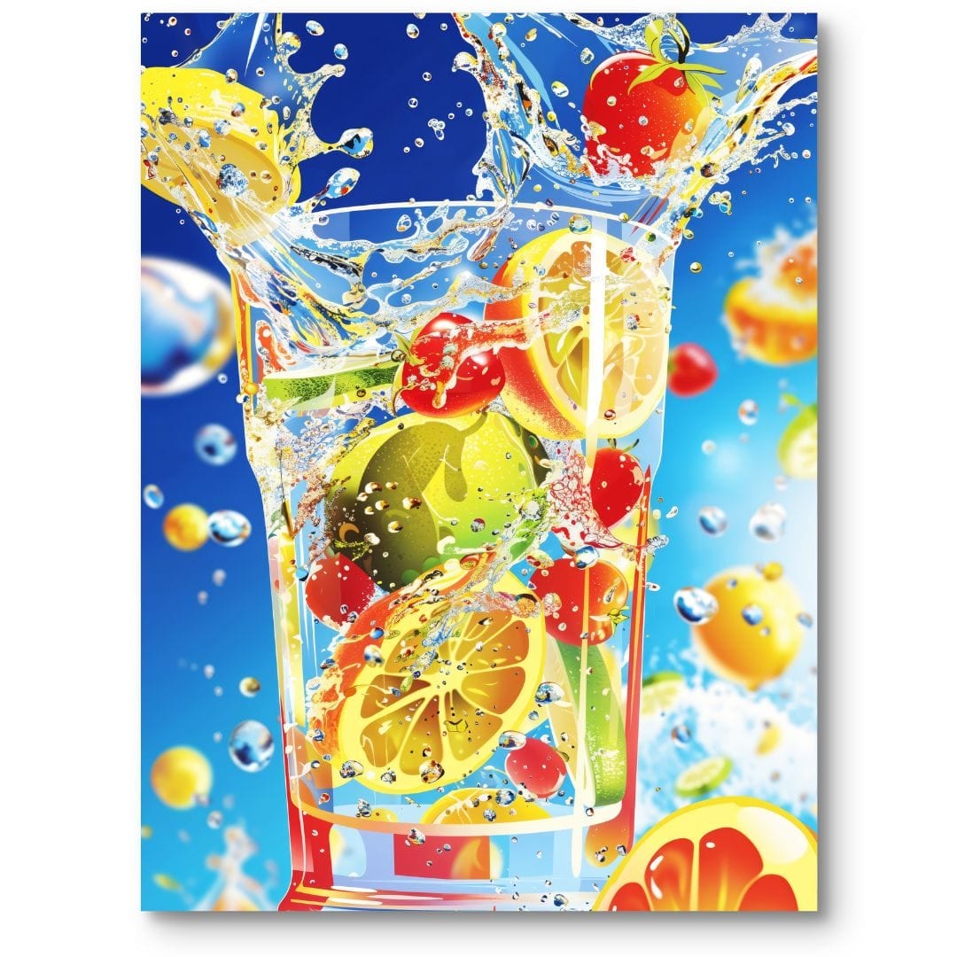 Plakat emanuje ruchem: owoce wydają się tańczyć pośród bąbelków wody, a grę światła dodatkowo podkreślają soczyste refleksy na powierzchni składników. Dominują tu odcienie niebieskiego, żółtego i czerwieni – kolory pełne optymizmu i świeżości, które skutecznie ożywią nawet najbardziej stonowaną przestrzeń.