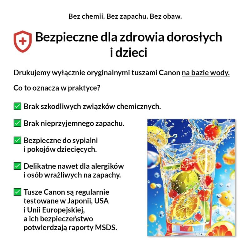 Tak, absolutnie! Drukujemy wyłącznie certyfikowanymi, bezwonnymi tuszami pigmentowymi Canon Lucia Pro na bazie wody. Są one w pełni bezpieczne dla zdrowia, nie zawierają rozpuszczalników i mogą być bez obaw stosowane w sypialniach i pokojach dziecięcych.