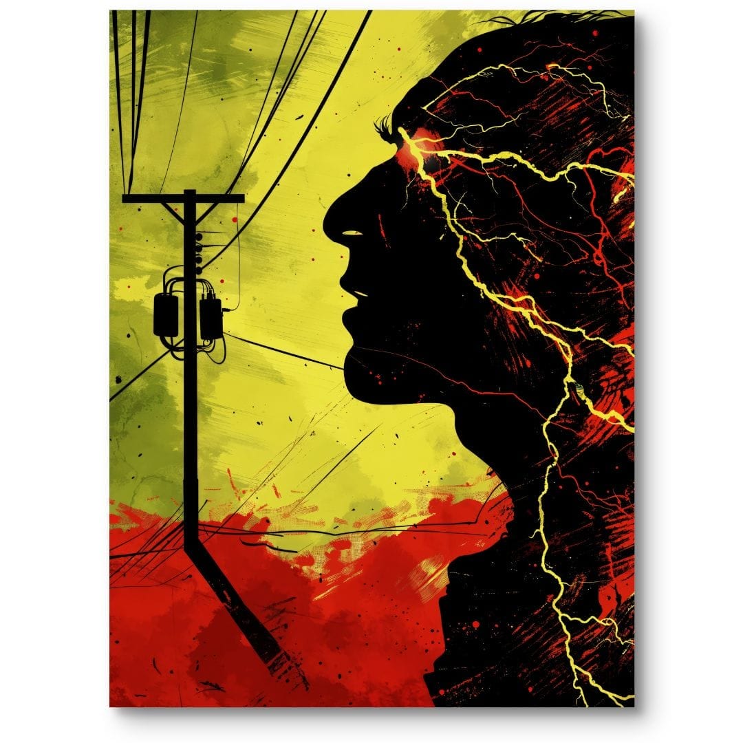 Plakat emanuje napięciem i energetycznością, stając się manifestem kreatywności i nowoczesności. To wizualna metafora dla potęgi ludzkiego umysłu i elektryczności, napędzających świat XXI wieku.