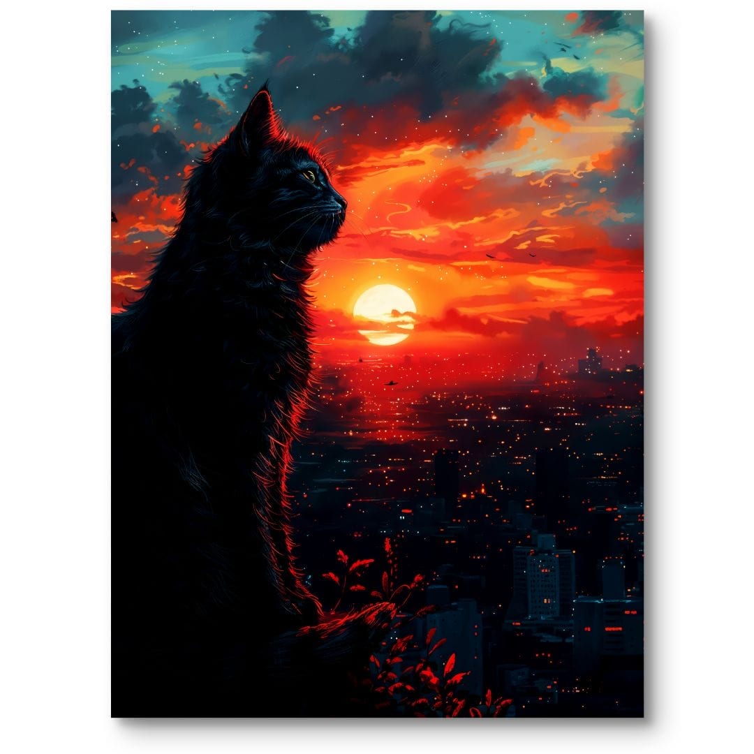 Kompozycja emanuje tajemniczością oraz nutą mroku, a sama sylwetka kota symbolizuje niezależność, intuicję i magię. Zachód słońca staje się tu metaforą zakończenia dnia, zmiany lub pojawienia się nowej perspektywy, dzięki czemu plakat nabiera głębi emocjonalnej i inspiruje do refleksji.