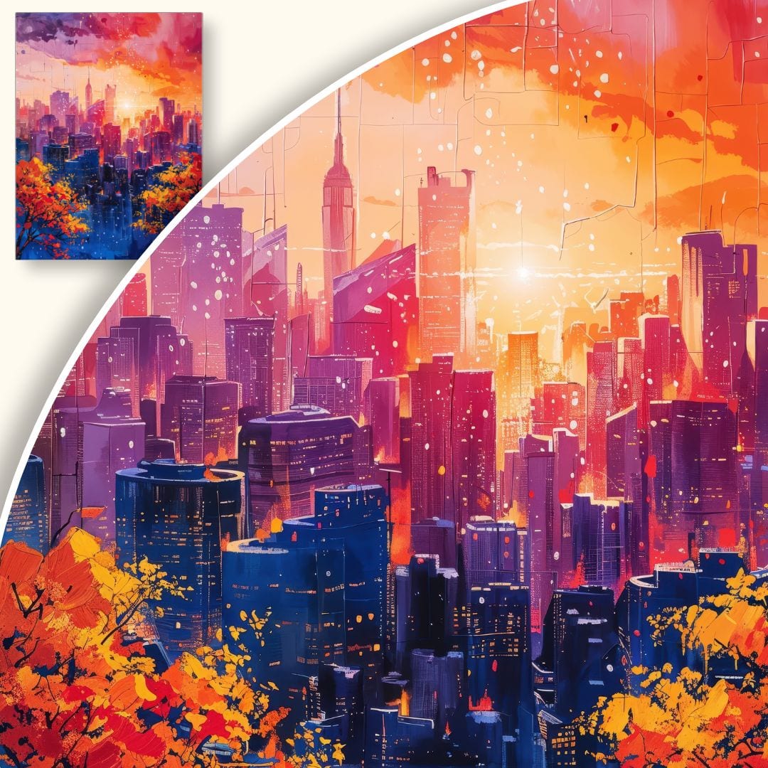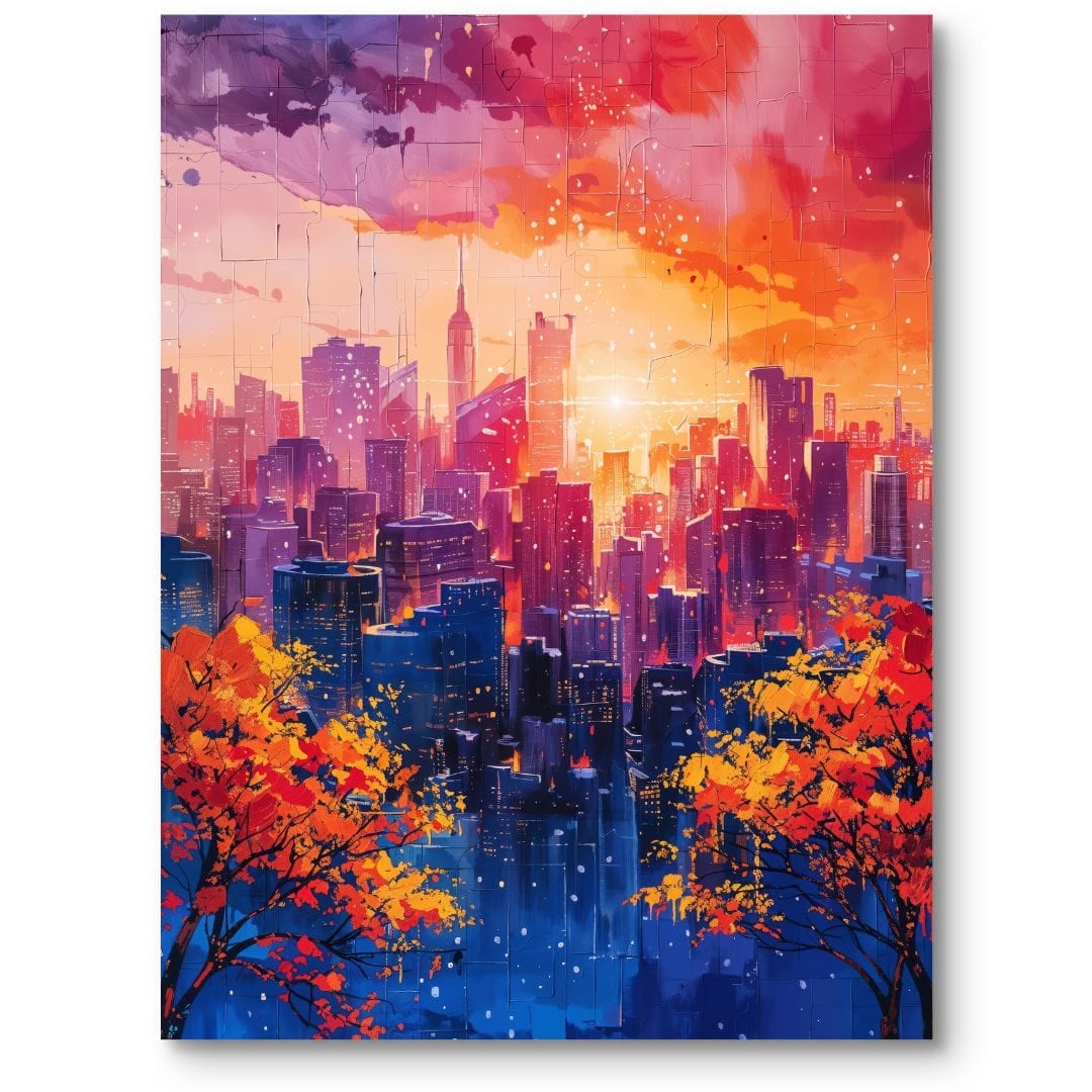 Plakat przyciąga wzrok starannie przemyślaną kompozycją: geometryczny porządek miejskiej zabudowy harmonizuje z miękkimi rozbłyskami światła zachodzącego słońca. Przenikanie się fioletów, pomarańczy i błękitów jest subtelne, tworząc spokojny i ciepły nastrój, który wnosi do wnętrza przyjazną atmosferę.