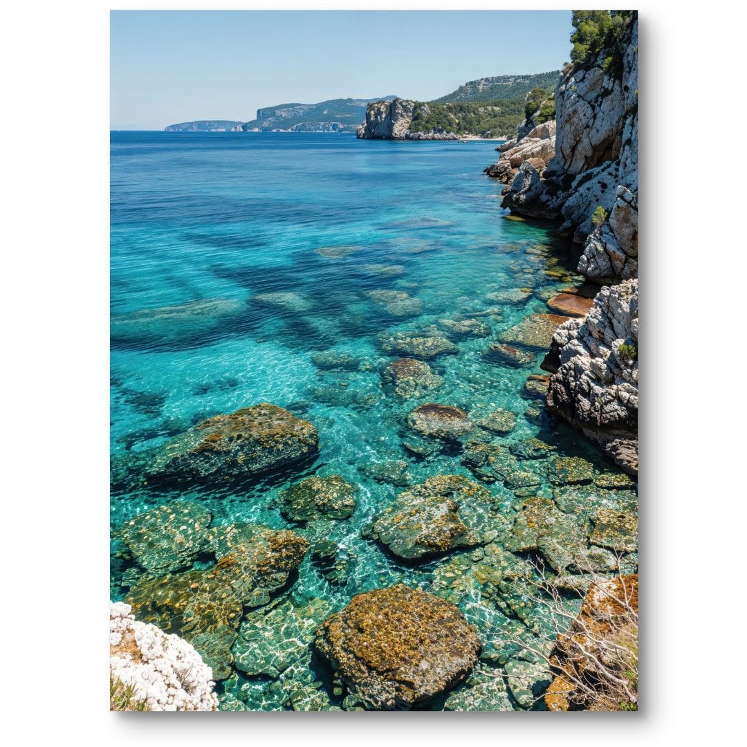 Plakat ukazuje zachwycający krajobraz nadmorski z krystalicznie czystą, turkusową wodą oraz imponującymi, białymi klifami porośniętymi bujną zielenią. Subtelne zestawienie błękitów, zieleni i bieli tworzy harmonijną scenę natury, która przyciąga wzrok i inspiruje do marzeń o wakacjach.