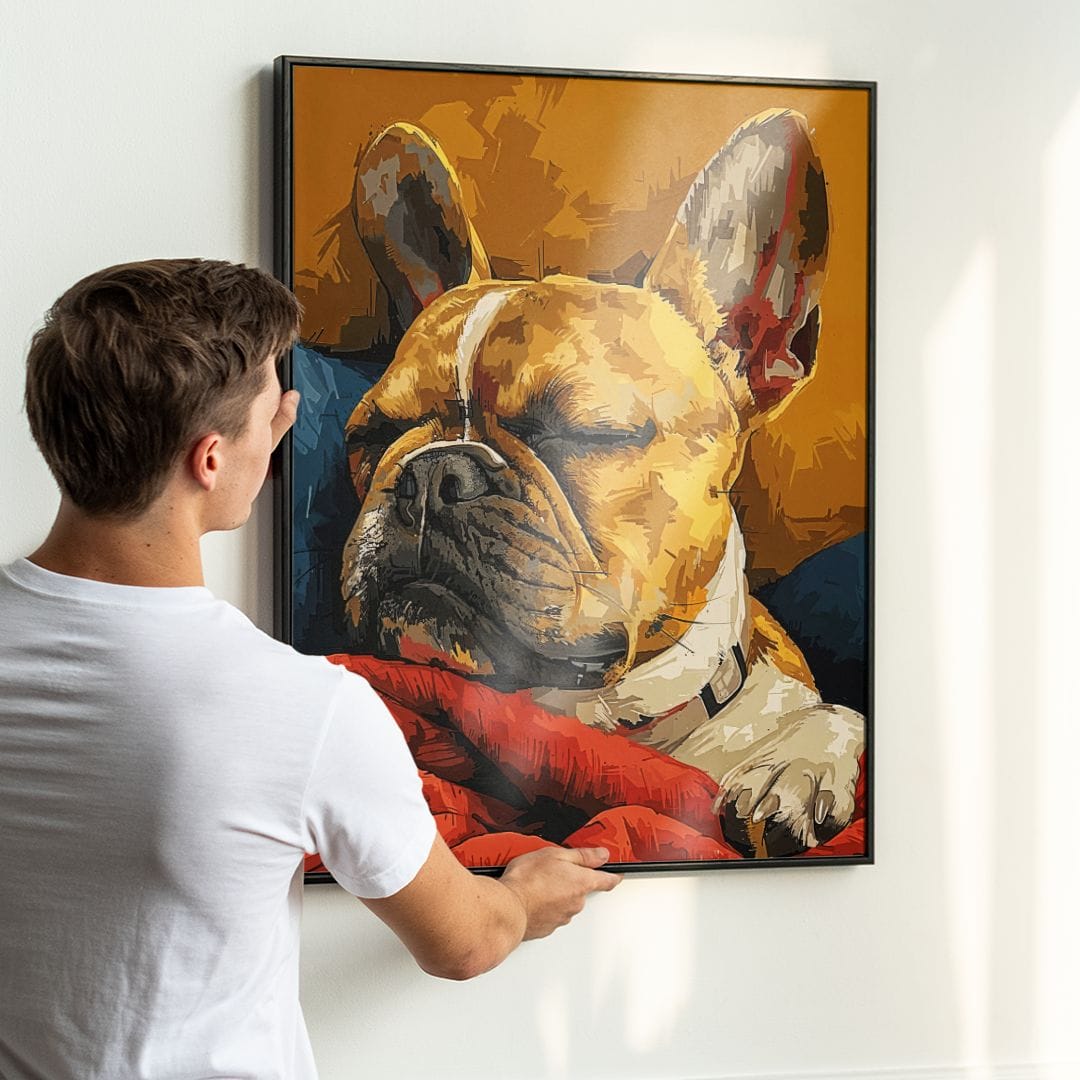 Centralna kompozycja skupia wzrok na wyrazistej twarzy buldoga, zaś ciepłe żółcie, żywe czerwienie i subtelne brązy tworzą aurę przytulności oraz spokoju. Delikatne, miękkie światło potęguje atmosferę relaksu i harmonii. Kolory zostały świadomie dobrane, aby harmonizować we wnętrzu oraz wprowadzać pozytywny nastrój.