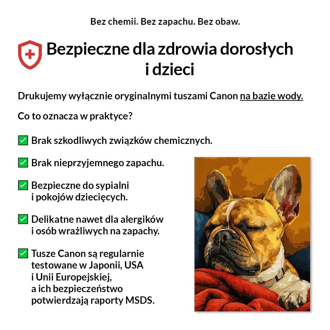 Tak, absolutnie! Drukujemy wyłącznie certyfikowanymi, bezwonnymi tuszami pigmentowymi Canon Lucia Pro na bazie wody. Są one w pełni bezpieczne dla zdrowia, nie zawierają rozpuszczalników i mogą być bez obaw stosowane w sypialniach i pokojach dziecięcych.