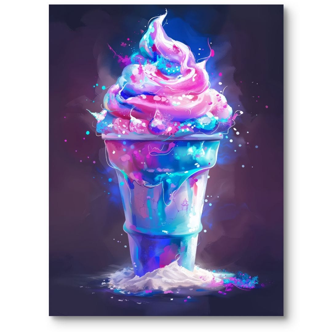 Ten plakat na ścianę to wyjątkowa, abstrakcyjna interpretacja kolorowego lodowego rożka, która przenosi widza w świat fantazji i radosnych wspomnień. Kompozycja tętni feerią barw i niezwykłych, niemal bajkowych akcentów, nadając deserowi niezwykłego, magicznego charakteru. To doskonały wybór do wnętrz, których celem jest wywołanie uśmiechu i pozytywnej energii, szczególnie w pokojach dziecięcych i młodzieżowych.