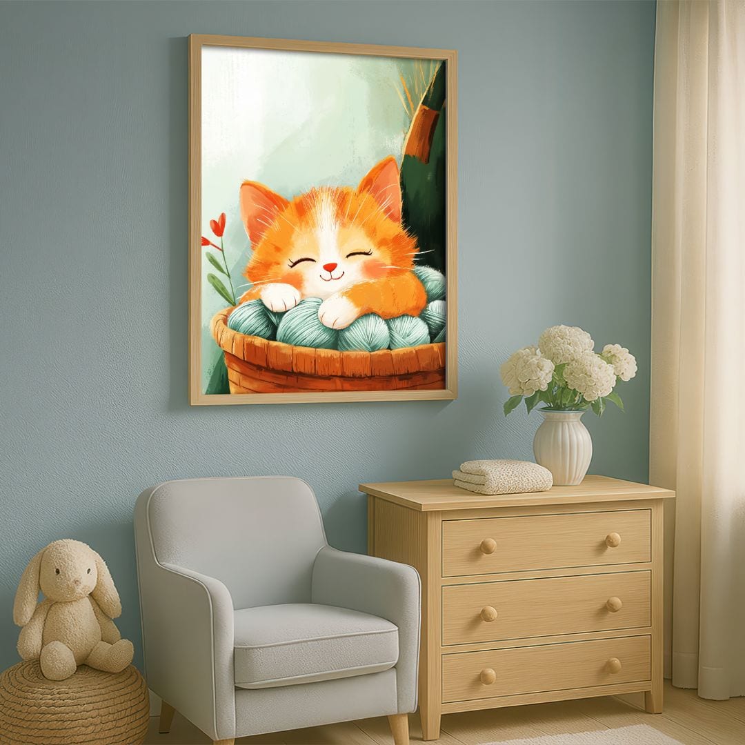 Plakat przedstawia rozczulający obrazek małego kotka, beztrosko wylegującego się w wiklinowym koszyku pełnym kolorowej włóczki. Scena natychmiast wprowadza spokojny nastrój i rozbudza pozytywne emocje, czyniąc tę dekorację doskonałym wyborem dla każdego wnętrza, do którego chcemy wprowadzić radosną atmosferę i domowe ciepło.