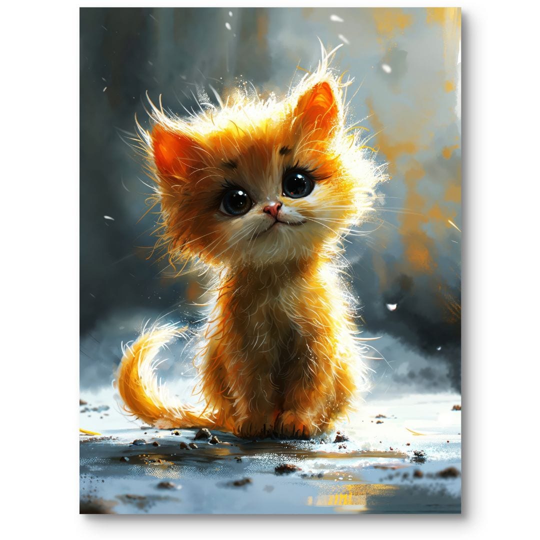 Kompozycję obrazu buduje wyrazisty środek, gdzie centralnie umieszczony kotek przyciąga uwagę swoim ujmującym spojrzeniem. Jasne, łagodne barwy tła subtelnie akcentują postać zwierzaka, nie odciągając przy tym wzroku widza od głównego motywu. Delikatne światło podkreśla strukturę futerka oraz miękkie linie, tworząc spójną, harmonijną całość pełną domowego ciepła.