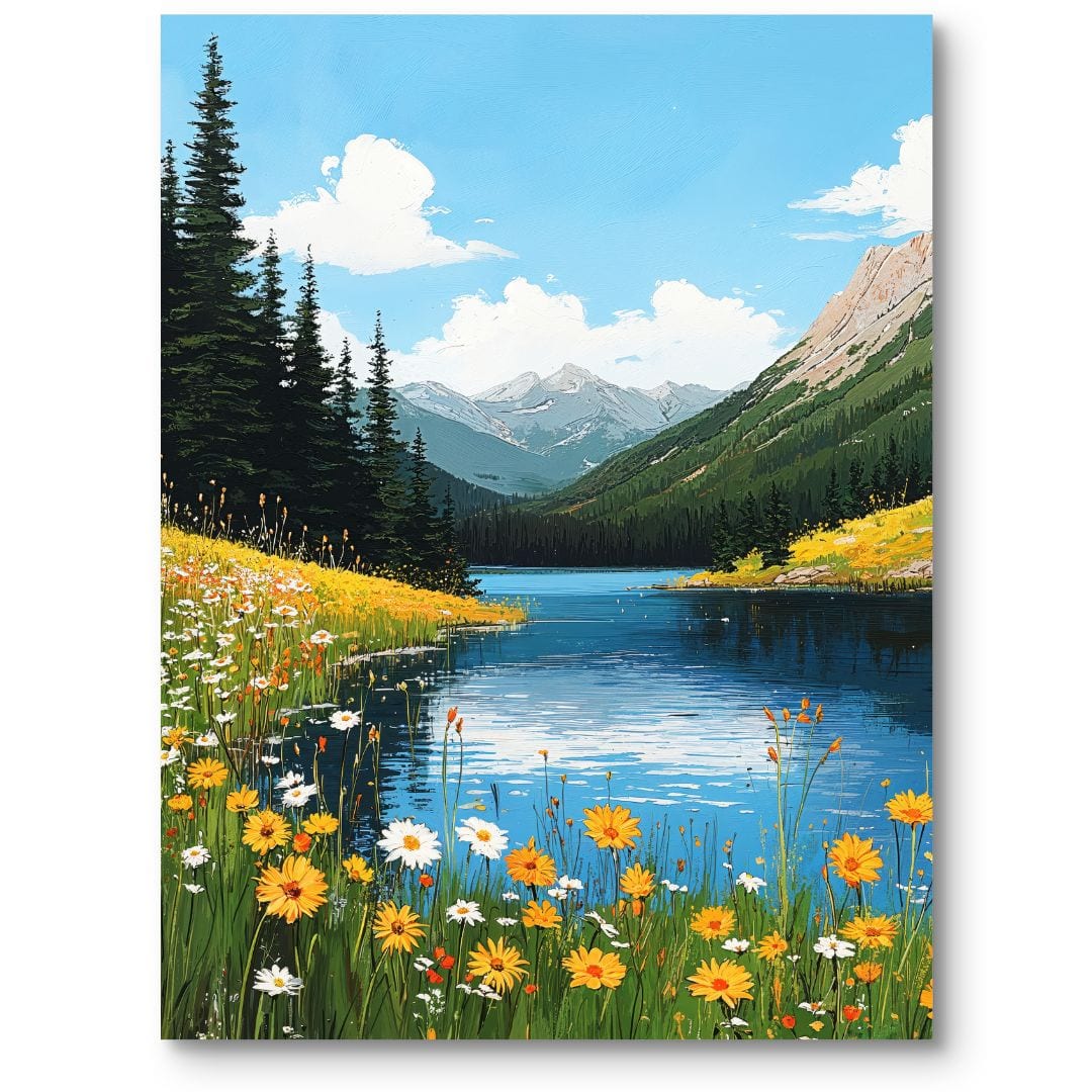 Kompozycja obrazu jest doskonale wyważona – centrum zajmuje tafla jeziora odbijająca błękit nieba i otaczające ją szczyty. Dominujące odcienie zieleni, błękitu i delikatnej żółci przywołują uczucie harmonii i beztroski, podczas gdy subtelne światło podkreśla fakturę traw, kwiatów i wody, nadając całości nastrojowy wymiar.