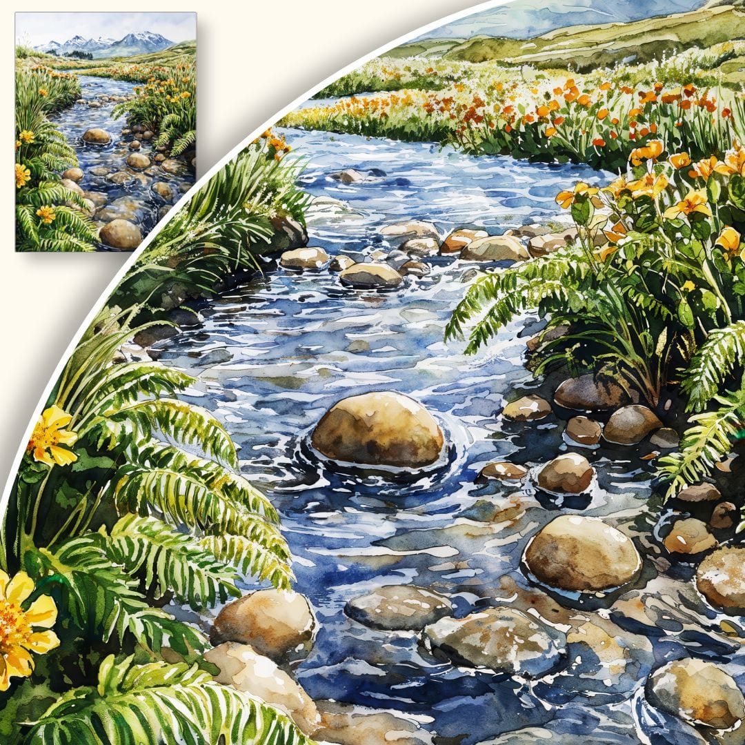 Zrównoważona kompozycja plakatu skupia uwagę na wijącym się strumieniu, który prowadzi wzrok wprost ku monumentalnym górom na horyzoncie. Harmonijna gama chłodnych błękitów wody oraz ciepłych odcieni zieleni i żółci roślinności została podkreślona naturalnym światłem, co tworzy iluzję trójwymiarowości i wzmacnia realistyczny charakter tej pracy.