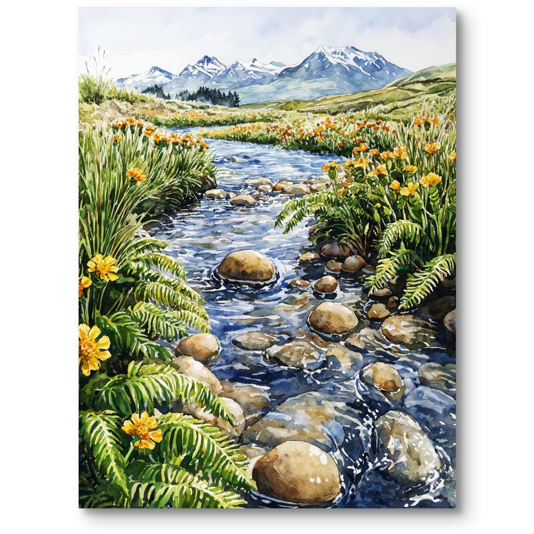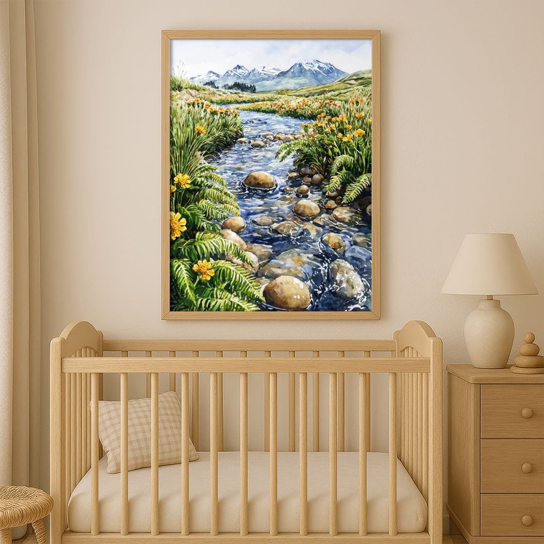 Plakat przedstawia zachwycający krajobraz górski z krystalicznie czystym strumieniem, który leniwie przepływa przez soczyście zieloną łąkę obsypaną żółtymi kwiatami. W tle rozpościerają się majestatyczne szczyty gór pokryte śniegiem, nadając całej scenerii panoramiczny i monumentalny charakter. To harmonijne zestawienie natury emanuje spokojem, inspirując do wyciszenia i zadumy nad pięknem otaczającego nas świata.