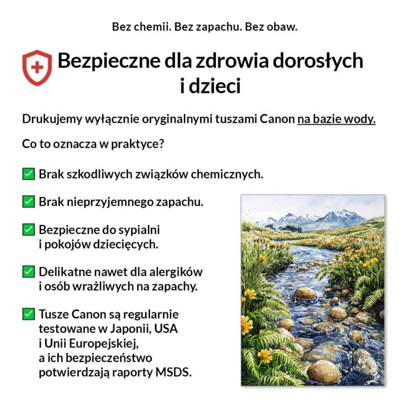 Tak, absolutnie! Drukujemy wyłącznie certyfikowanymi, bezwonnymi tuszami pigmentowymi Canon Lucia Pro na bazie wody. Są one w pełni bezpieczne dla zdrowia, nie zawierają rozpuszczalników i mogą być bez obaw stosowane w sypialniach i pokojach dziecięcych.