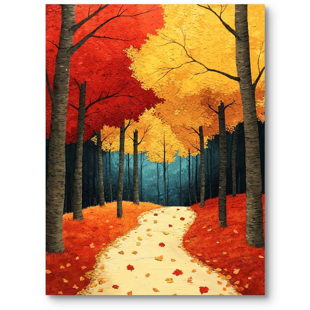 Obraz ukazuje malowniczą jesienną alejkę, w której główną rolę odgrywają intensywnie czerwone i żółte liście. Drzewa tworzą naturalny tunel, a opadające liście wprowadzają dynamikę i niepowtarzalny urok, charakterystyczny dla jesiennych pejzaży.