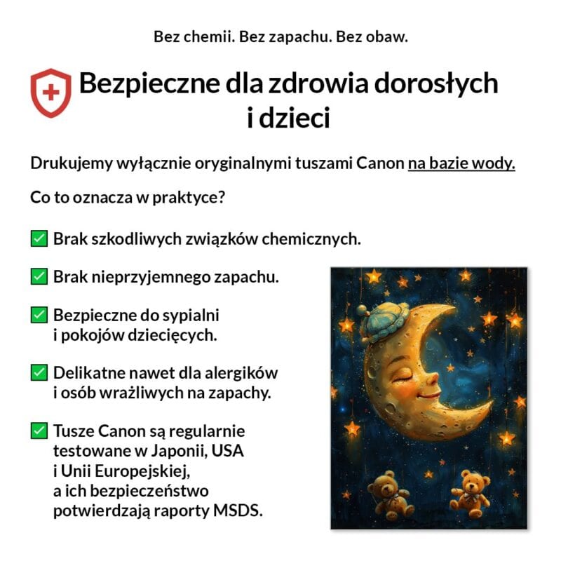 Tak, absolutnie! Drukujemy wyłącznie certyfikowanymi, bezwonnymi tuszami pigmentowymi Canon Lucia Pro na bazie wody. Są one w pełni bezpieczne dla zdrowia, nie zawierają rozpuszczalników i mogą być bez obaw stosowane w sypialniach i pokojach dziecięcych.