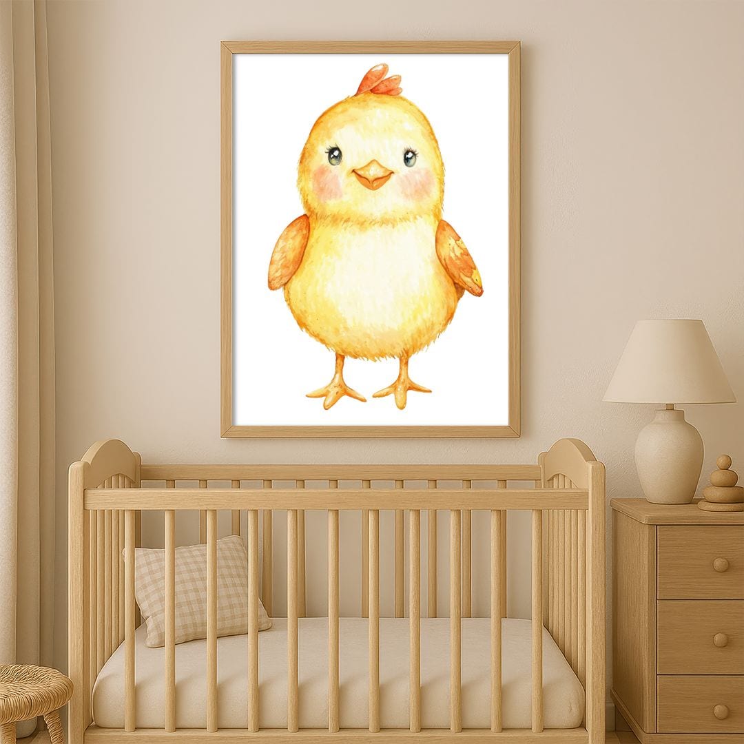 Ten uroczy plakat przedstawia rozkosznego kurczaczka – zwierzątko, które wprowadza do wnętrza ciepło, życzliwość i wiosenną radość. Motyw ten sprawdzi się szczególnie w pokoju dziecięcym, tworząc atmosferę pełną szczęścia i beztroski.
