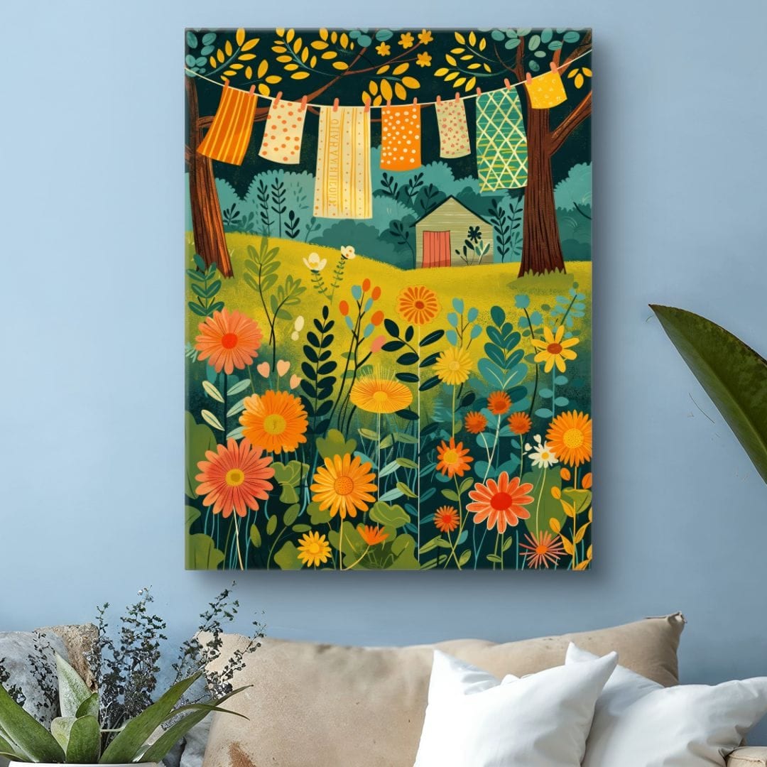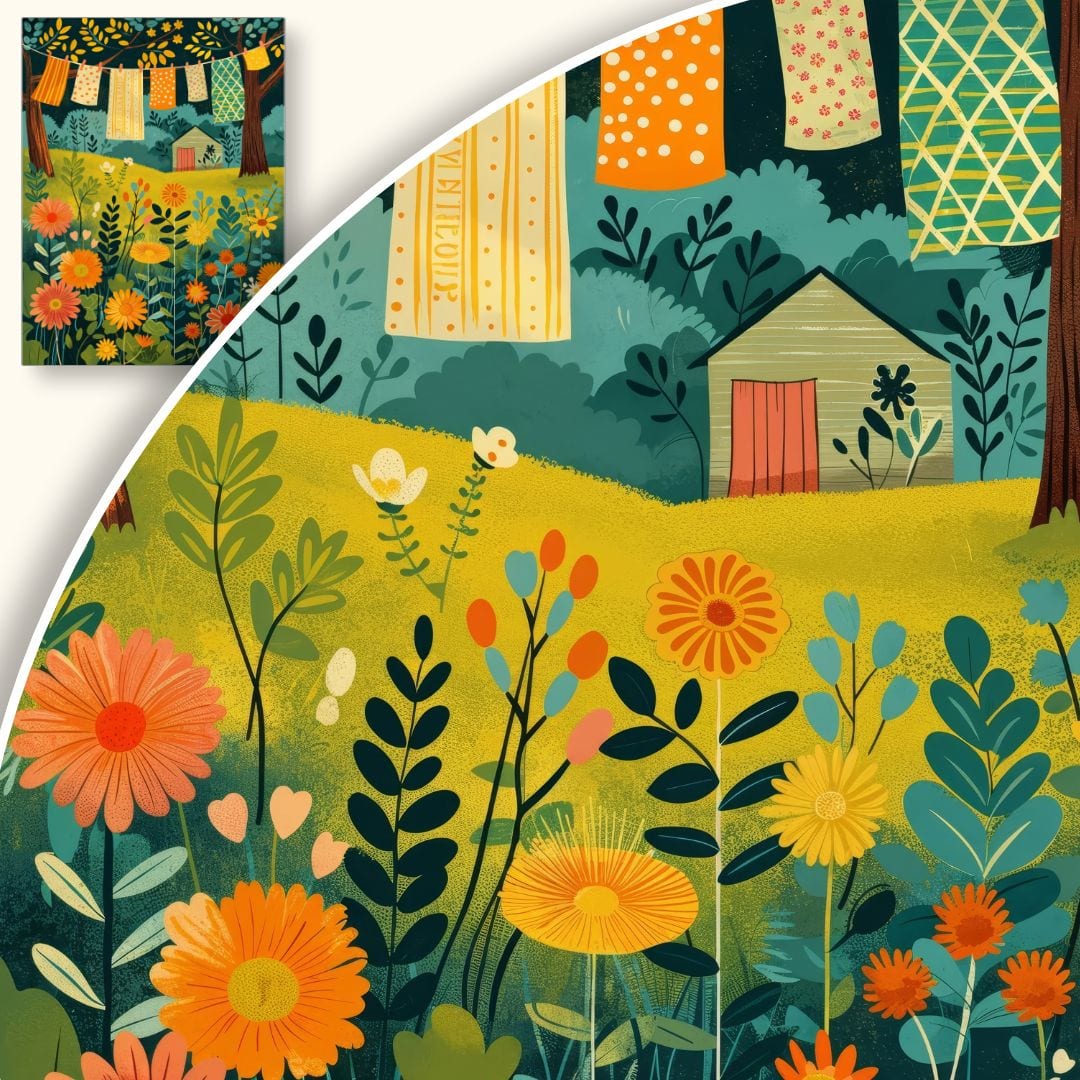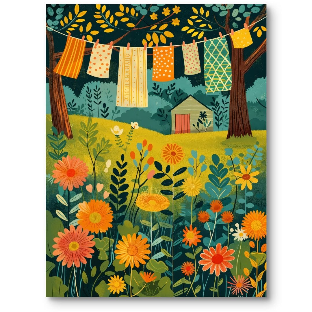 Plakat ukazuje sielankowy, wiejski krajobraz z pełnymi uroku szczegółami – soczyste kwiaty oraz pranie swobodnie suszące się na sznurku wśród bujnej zieleni. To kompozycja celebrująca spokój życia na wsi, bliski kontakt z naturą i urok codziennych przyjemności.