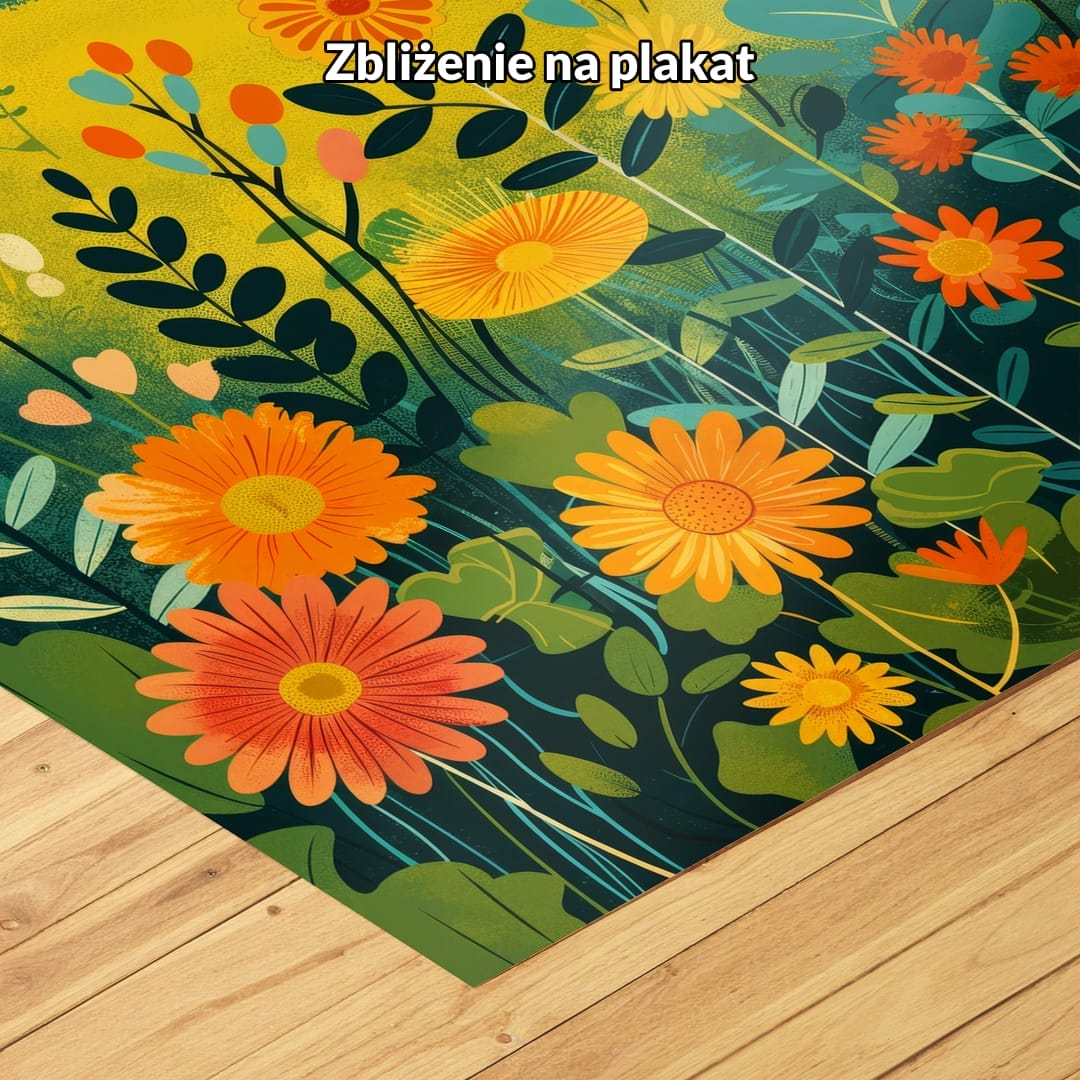 Kolory użyte na plakacie – zielony, żółty i pomarańczowy – nie tylko rozjaśniają wnętrze, ale również sprzyjają dobremu samopoczuciu. Zieleń uspokaja, żółcień pobudza kreatywność, a pomarańcz dodaje energii – to przemyślana paleta, która wprowadza do pomieszczenia pozytywną atmosferę.