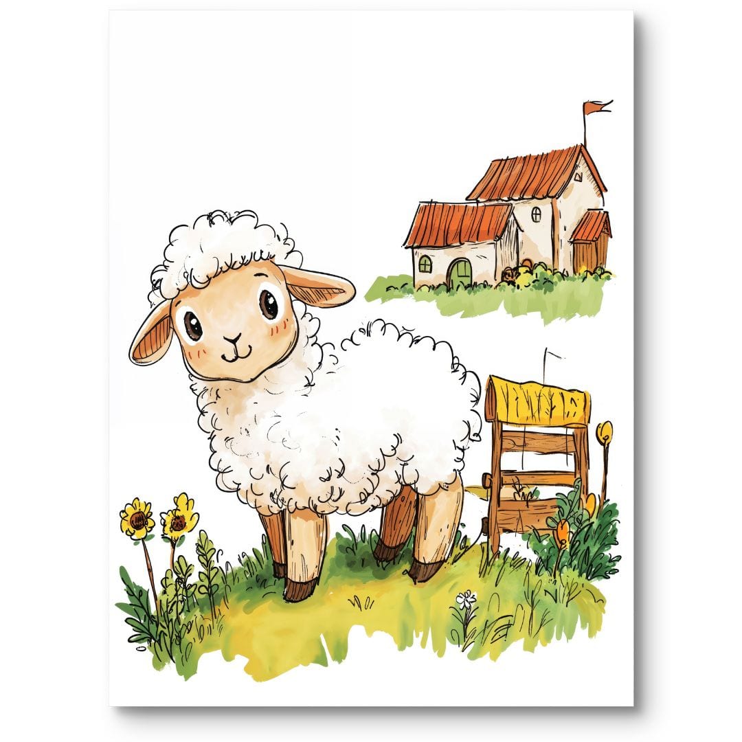 Ten plakat przenosi nas do sielskiej scenerii wsi, gdzie uśmiechnięta owieczka na pierwszym planie staje się symbolem beztroski i radości. W tle rozpościera się malownicza zagroda otoczona kwitnącymi polami, tworząc idylliczny pejzaż i poczucie błogiego spokoju. Żywe, jasne barwy wzmacniają pogodny klimat tej ilustracji.