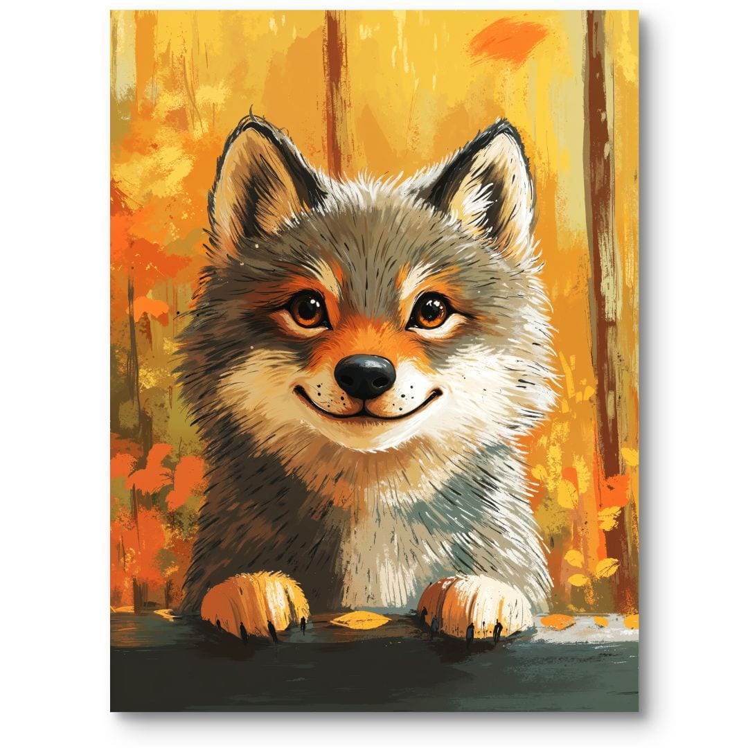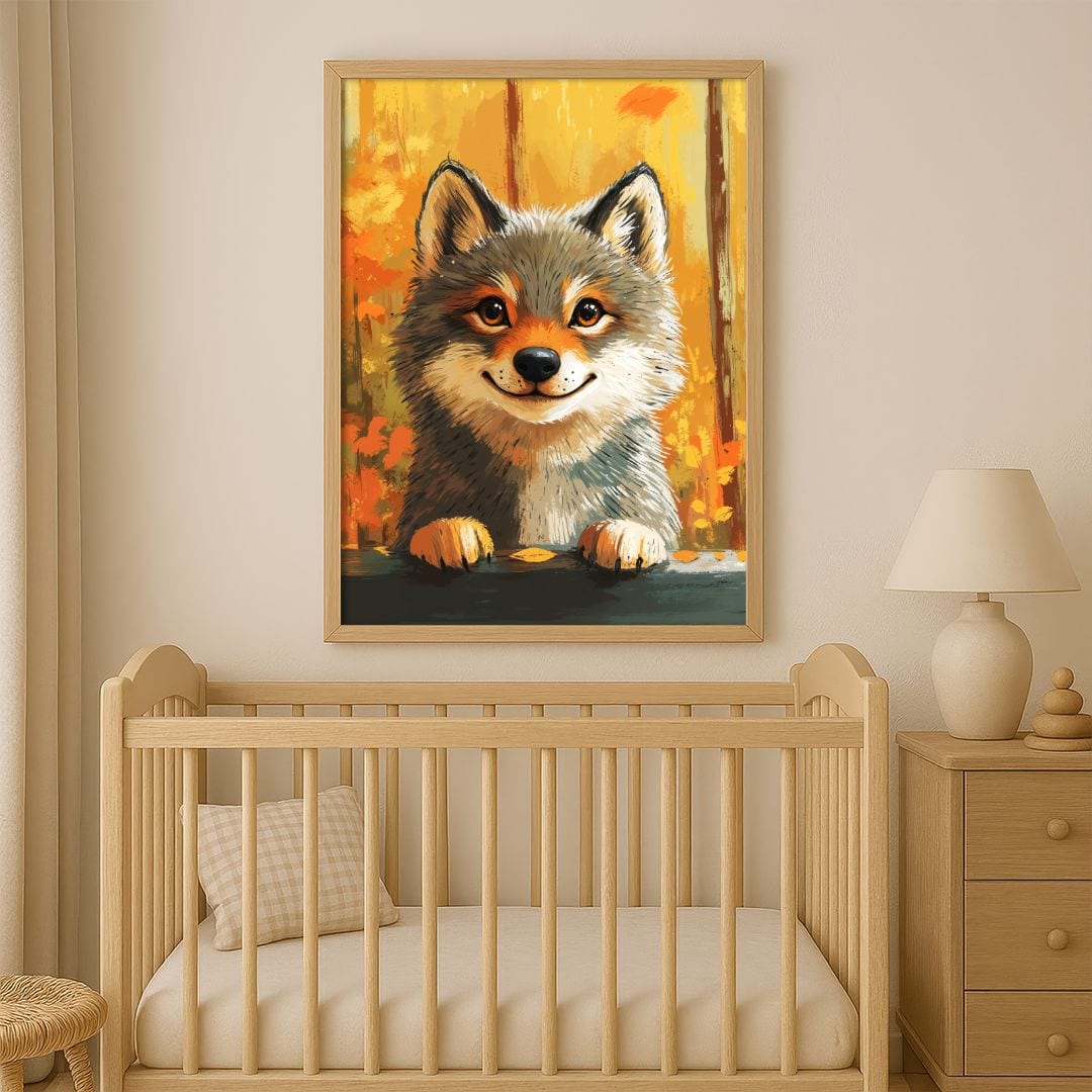 Ten przepiękny plakat ukazuje pełnego wdzięku lisa, delikatnie wyłaniającego się z rozświetlonego barwami jesieni tła. Zwierzę oczarowuje pogodnym wyrazem pyszczka i dużymi, błyszczącymi oczami, przywodzącymi na myśl ilustracje z ulubionych bajek. Wokół niego rozpościerają się liście w odcieniach pomarańczy i złota, nadając kompozycji ciepłego, bajkowego charakteru, który przywołuje wspomnienie spacerów po magicznym, jesiennym lesie.