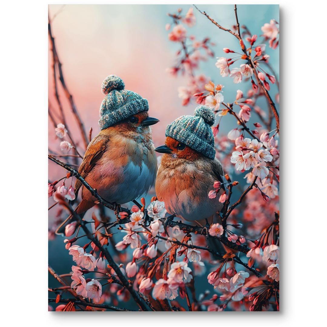 Ten niezwykły plakat ukazuje dwa urocze ptaki spoczywające na rozkwitających gałązkach wiśni. Scena pełna lekkości i radosnego uroku oddaje ducha budzącej się do życia wiosny, symbolizując odnowę i optymizm. Humorystycznym akcentem są zabawne czapeczki, które zdobią ptasie głowy i wprowadzają pogodny, dziecięcy klimat, idealnie komponując się z wystrojem pokoju najmłodszych.
