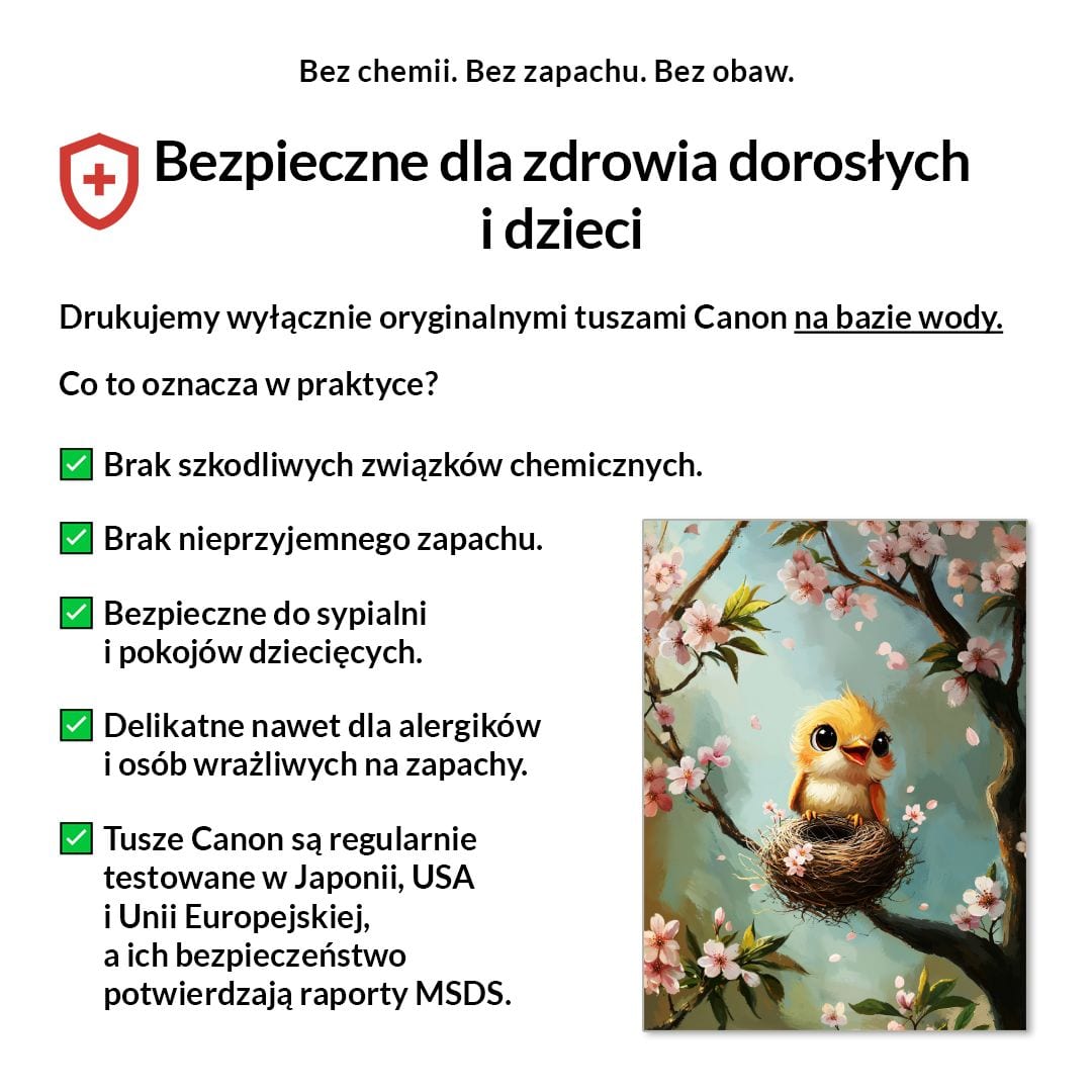 Tak, absolutnie! Drukujemy wyłącznie certyfikowanymi, bezwonnymi tuszami pigmentowymi Canon Lucia Pro na bazie wody. Są one w pełni bezpieczne dla zdrowia, nie zawierają rozpuszczalników i mogą być bez obaw stosowane w sypialniach i pokojach dziecięcych.