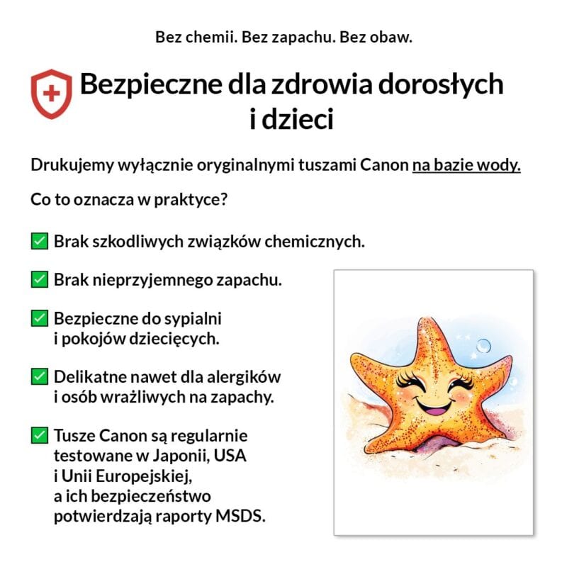 Tak, absolutnie! Drukujemy wyłącznie certyfikowanymi, bezwonnymi tuszami pigmentowymi Canon Lucia Pro na bazie wody. Są one w pełni bezpieczne dla zdrowia, nie zawierają rozpuszczalników i mogą być bez obaw stosowane w sypialniach i pokojach dziecięcych.