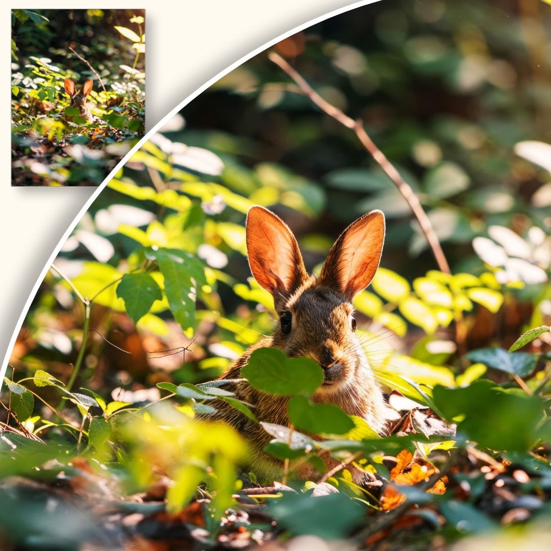 Plakat przedstawia urzekającą scenę z natury, której bohaterem jest królik ukryty w gęstwinie zieleni. Zwierzę z zaciekawieniem spogląda w stronę widza, wprowadzając atmosferę lekkości i autentycznej bliskości z naturalnym światem. Taki motyw sprawia, że każdy może poczuć spokój i harmonię płynącą z kontaktu z przyrodą.