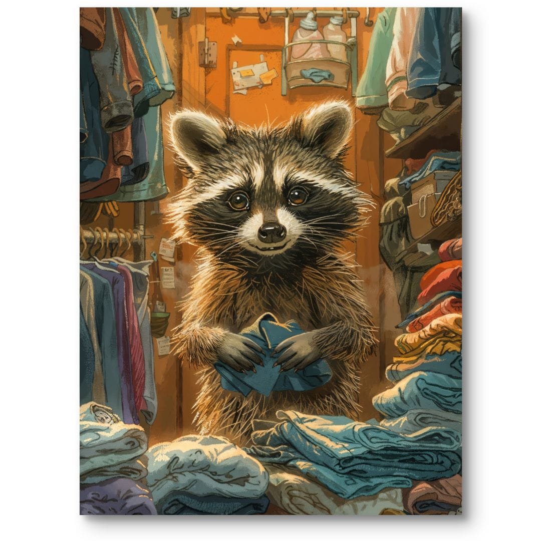 - Realistyczny plakat z szopem w garderobie – humor i wdzięk w jednym.