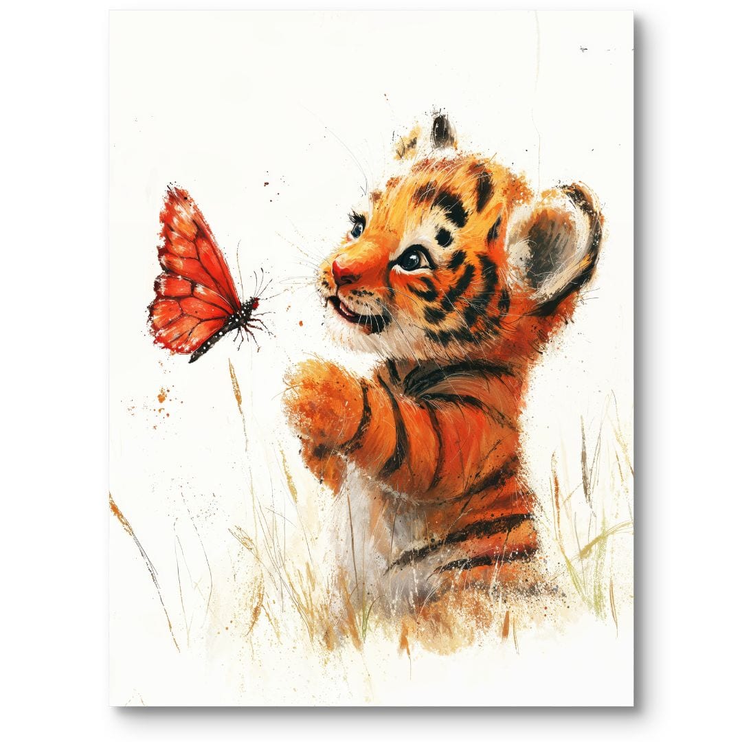 Plakat przedstawia urokliwą scenę z życia młodego, pełnego ciekawości tygryska, który z zachwytem obserwuje lądującego na jego łapie kolorowego motyla. To obraz tętniący radością i naturalną świeżością, ukazujący magię prostych chwil w świecie przyrody.