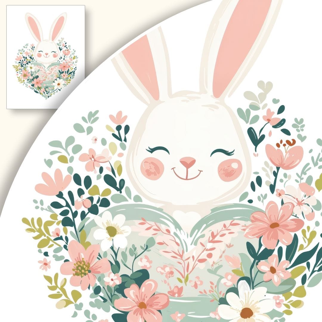 Centrala kompozycji to sympatyczny królik, malowniczo otoczony kwiatami w tonacjach bieli, różu i zieleni. Miękkie światło oraz pastelowa kolorystyka budują harmonijny, łagodny klimat, zachęcający do odpoczynku i wyciszenia.