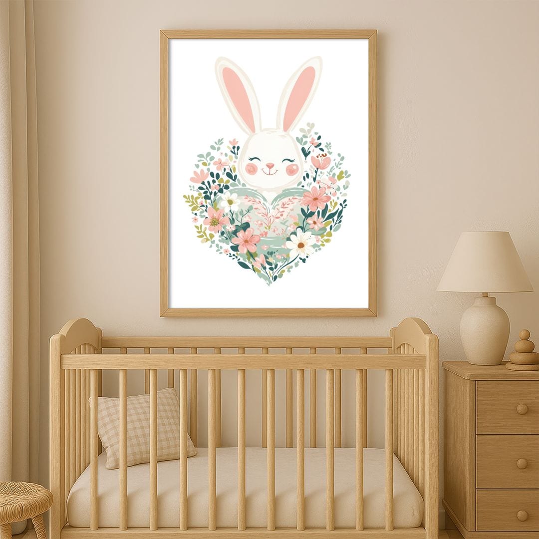 Plakat prezentuje uroczy wizerunek królika otoczonego pastelowymi kwiatami, przenosząc odbiorcę w świat bliskości natury i beztroskiej radości. Motyw zwierzęcy w połączeniu z delikatną roślinną oprawą stwarza bajkową, ciepłą atmosferę, która zachwyci każdego małego miłośnika przyrody.