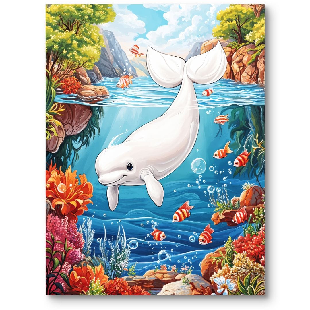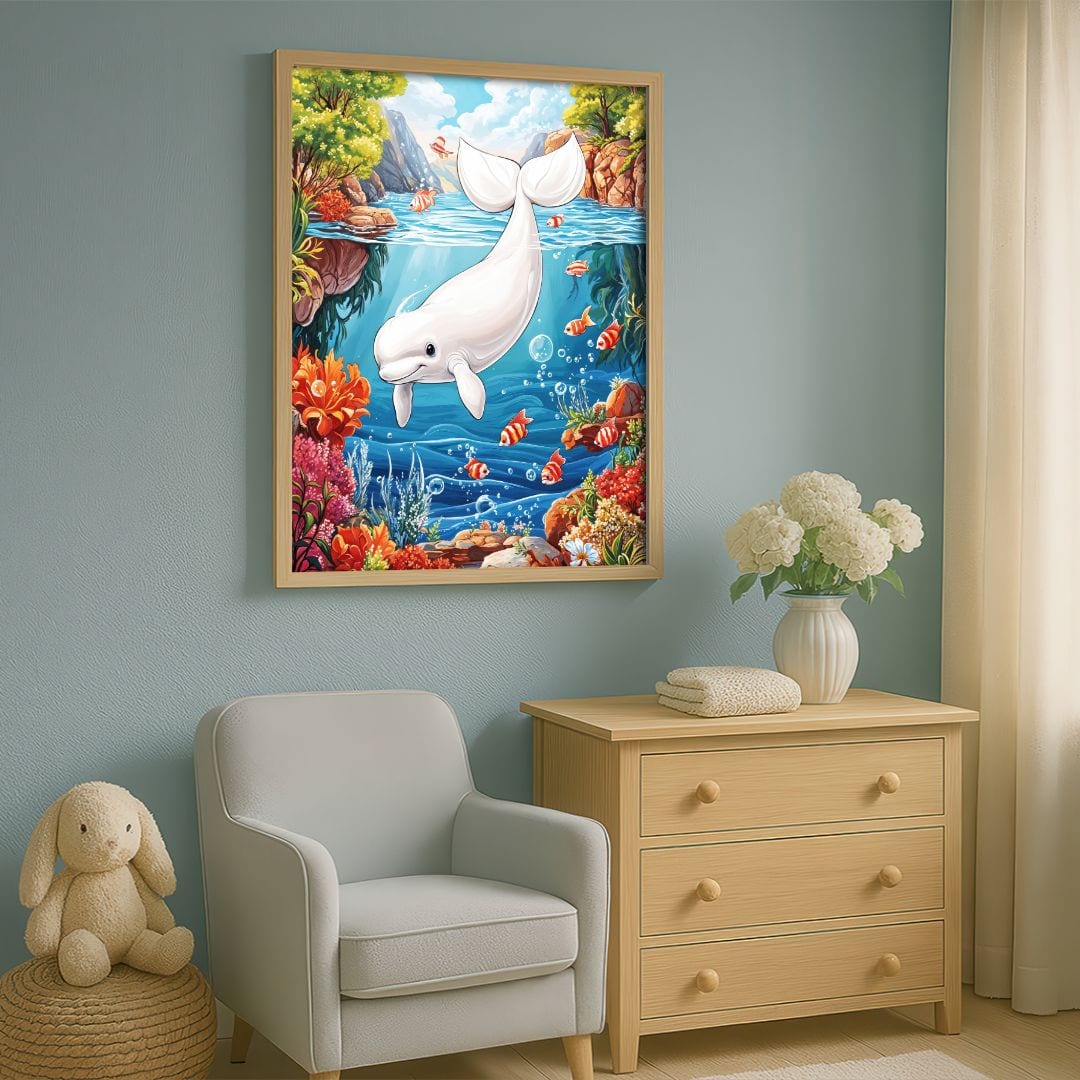 Plakat ukazuje niezwykle urokliwą scenę podwodnego życia, w której centralną postacią jest biały wieloryb otoczony rafą koralową i barwnymi ławicami ryb. Spokojne, niebieskie głębiny oceanu tworzą tło dla tego naturalnego spektaklu, zachwycając bogactwem kształtów i kolorów.