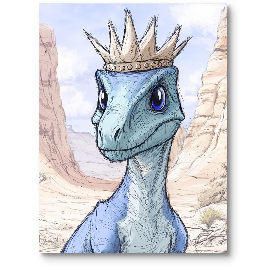 Ten plakat to niecodzienne połączenie prehistorycznego motywu z pełnym uroku humorem – dinozaur w królewskiej koronie staje się tu intrygującym bohaterem. Artystyczna, lekko surrealistyczna wizja zanurza się w scenografii pustynnych klifów, dzięki czemu postać zabawnego gada przyciąga wzrok i wywołuje uśmiech. To kreatywne dzieło, które wprowadza do przestrzeni element baśni i fantazji.
