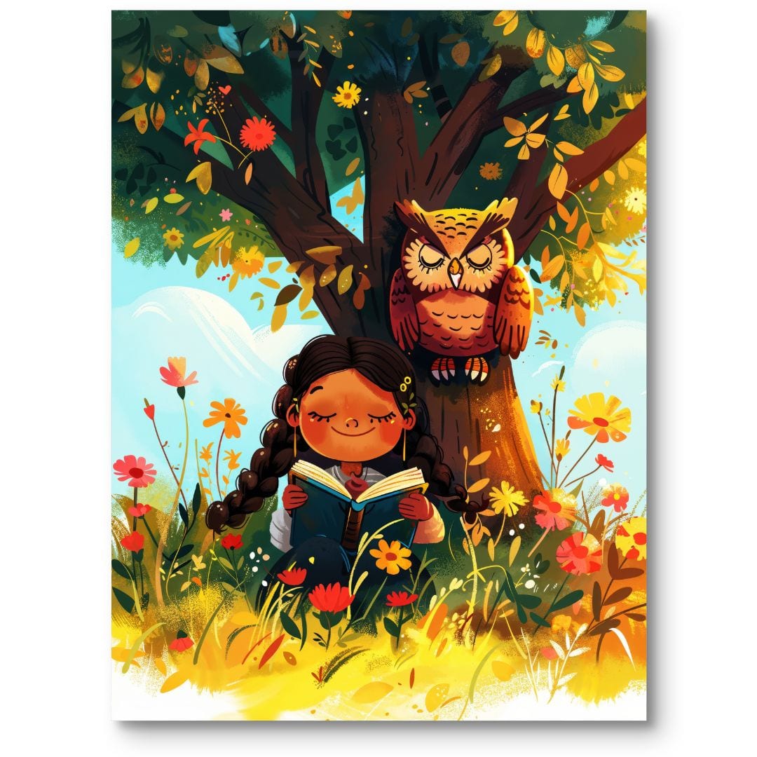 Prezentowany plakat to pogodna ilustracja młodej dziewczyny zatopionej w lekturze, siedzącej pod rozłożystym drzewem. Towarzyszy jej sowa – ponadczasowy symbol mądrości i wiedzy. Otaczające bohaterkę barwne kwiaty podkreślają harmonię sceny i sugerują miłość do natury, a kontakt z książką wydobywa radość płynącą z obcowania z literaturą.